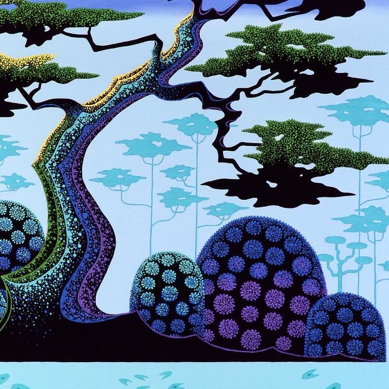 Larissa Holt, a student of distinguished artist Eyvind Earle (1916-2000), uses bold colors and breathtaking scenery to create images of Nature in her own unique style. "Lotus by Moonlight" is a limited edition giclee on stretched canvas by Holt, numbered and bearing Holt's authorized signature. This piece comes gallery wrapped with a black border, and is ready to hang. Includes Certificate of Authenticity! Measures approx. 21.5" x 27" x 1.5" (image).