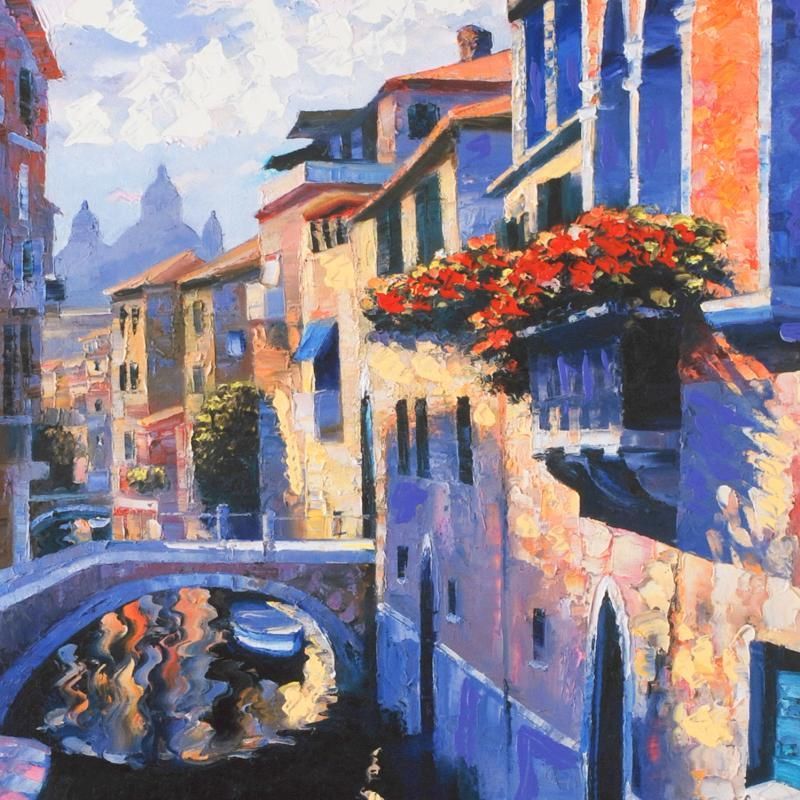 With bright colors and lush textures, Howard Behrens' artwork adds a tropical and exotic feel to any art collection. "Magic of Venice III" is a limited edition hand embellished giclee on canvas. Numbered and hand signed by the artist. Measures approx. 16" x 20"(image).