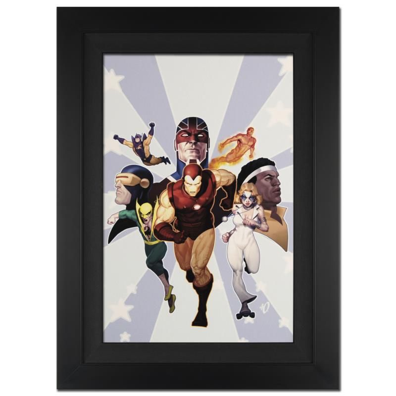 A piece of comic book history, this limited edition piece from art originally drawn by Ariel Olivetti, depicts Iron Man, Iron Fist, Dazzler, Cyclops, Captain Britain, Yellow Jacket and Human Torch. Ariel Olivetti's first work with Marvel was The Last Avengers Story in 1995. Since then, Olivetti has done work for Iron Man, X-Men, and Thor, among others. "Iron Age: Omega #1" is an extremely limited edition giclee on canvas by Ariel Olivetti presented by Marvel Comics, hand signed by the great Stan Lee and numbered out of only 10! This piece comes custom framed and ready to hang. Measures approx. 25" x 34" (with frame), 18" x 27" (image).