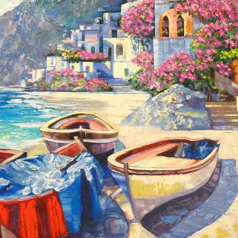With bright colors and lush textures, Howard Behrens' (1933-2014) artwork adds a tropical and exotic feel to any art collection. "Memories of Capri" is a limited edition hand embellished giclee on canvas. Numbered and hand signed by the artist. Measures approx. 40" x 30"(image).