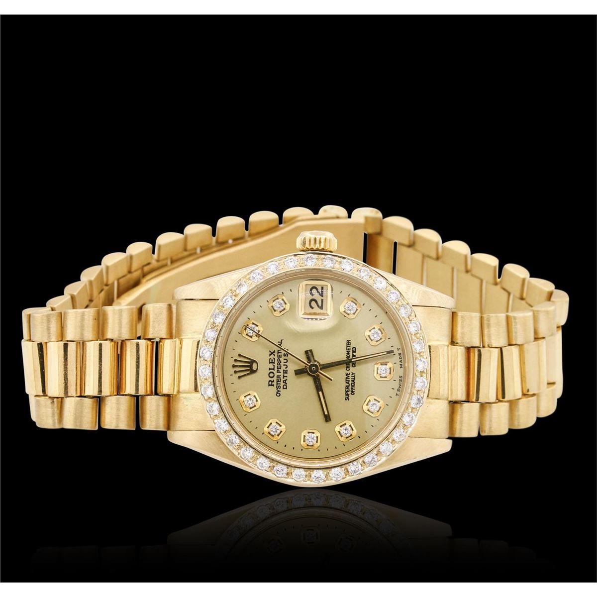 One, hand crafted & machine milled Rolex Mid-Size DateJust wristwatch electronically tested 18KT yellow gold, Case: 30mm oyster, 18KT yellow gold Crown: twinlock with logo, Custom Bezel: diamond set, Crystal: acrylic cyclops lens. Movement: superlative chronometer, Custom Dial: Champagne color, with baton hands, and diamond markers, Circa: 1982, Date Window: 3 o'clock position, non-quick set, Custom Bracelet: 18KT yellow gold jubilee style, bright polish & brushed finish, Condition: G-4 Average. Six and three quarter inch length, adjustable. Containing: Thirty Six prong set round brilliant cut diamonds, approximate total weight equals 0.86ct. Clarity SI-1 to SI-2 Average. Color: G - H. Total Weight of Diamonds 0.86ct. Total Weight of Watch 95.20 grams. AIG Appraised at $15,440.00.