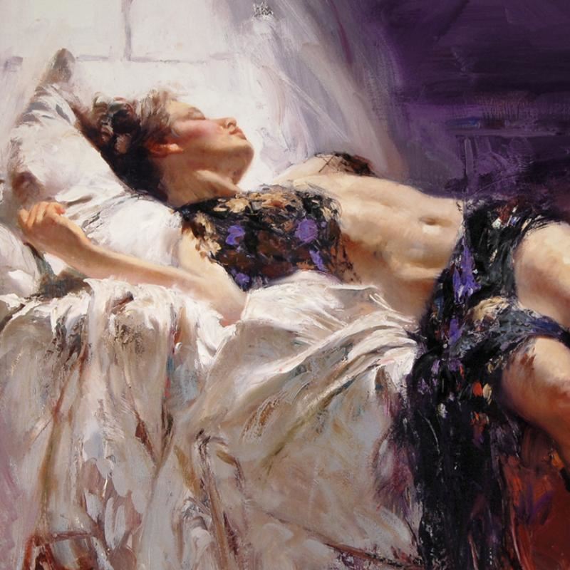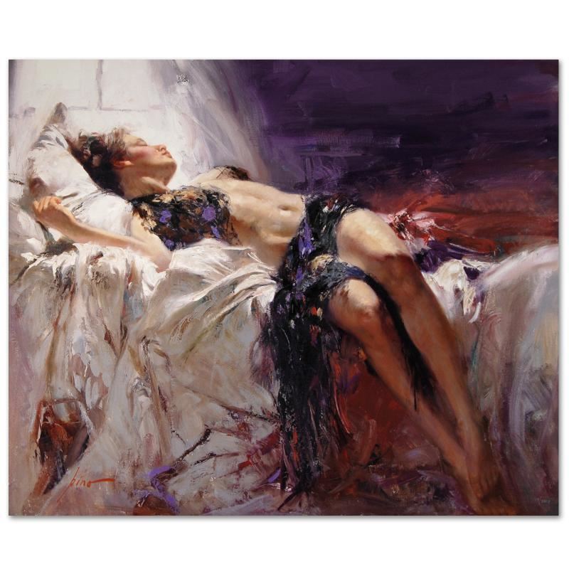Pino's portraits allow glimpses into intensely personal, intimate spaces, conveying emotion through rich, warm color and sensual brushwork. "Morning Dreams" is a limited edition giclee on stretched canvas that has been hand-embellished by Pino himself, CP numbered 14 out of 35 and hand signed by Pino (1939-2010). Includes Certificate of Authenticity! Measures approx. 42" x 36" (image).