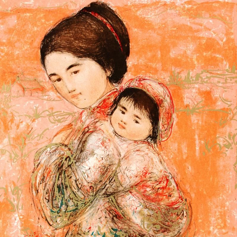"Morning Stroll" is a limited edition lithograph on paper, numbered and hand signed by Edna Hibel (1917-2014). Measures approx. 21.5" x 31.5" (with border), 17" x 25" (image).