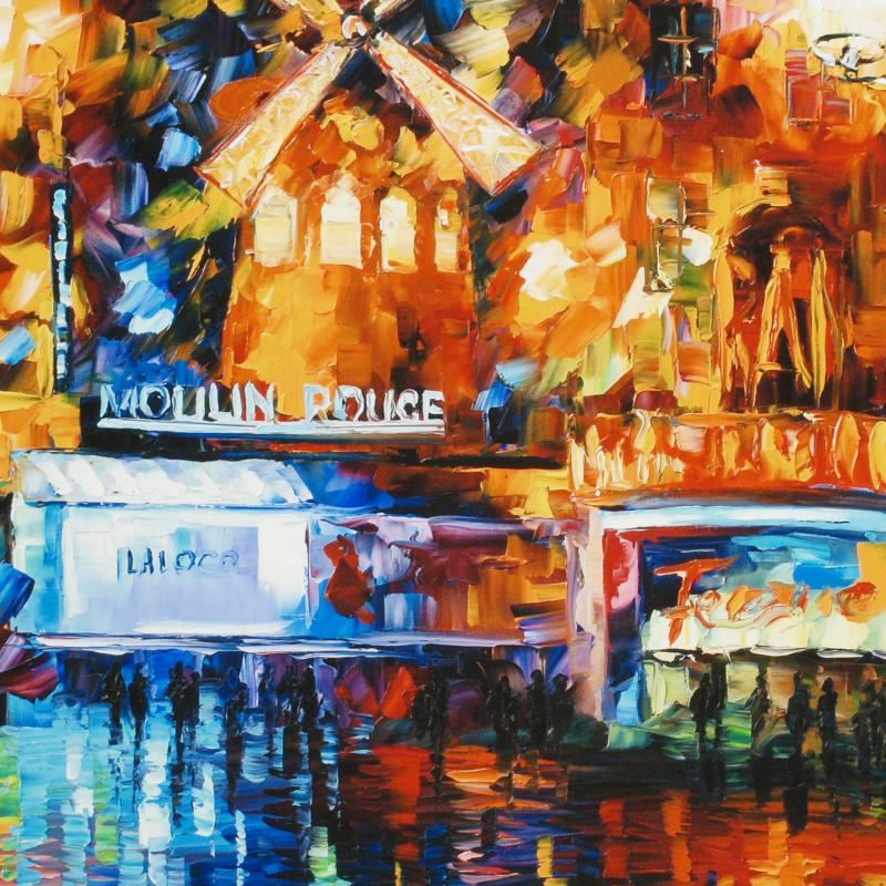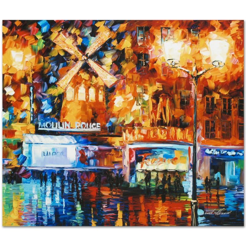 Leonid Afremov's masterful use of color and texture make his paintings unique collectibles that are sure to brighten any wall. "Moulin Rouge" is a limited edition giclee on stretched canvas, numbered in verso and bears Afremov's authorized signature. This piece comes gallery wrapped and ready to hang. Measures approx. 22.5" x 19.5" (image).