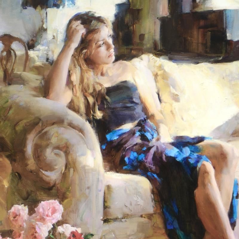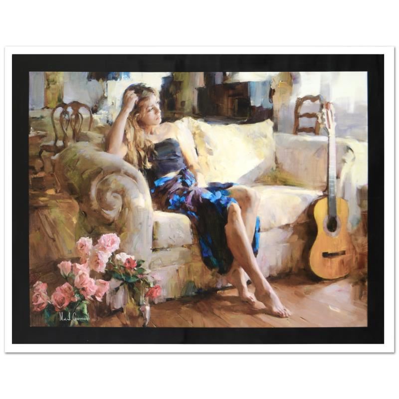 "Music in the Afternoon" is a limited edition hand embellished giclee on canvas by the husband and wife team, Mikhail and Inessa Garmash! This piece is numbered and hand signed by the artists! Measures approx. 40" x 30" (image).