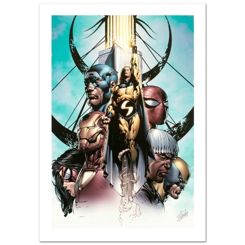 A piece of comic book history, this limited edition print, drawn by David Finch, depicts Captain America and other characters from the Marvel Universe. In 2003, Finch came to Marvel Comics for a year-long arc on Ultimate X-Men, after which he began work on The Avengers and thereafter The New Avengers. He has also worked on such titles as Captain America, Spider-Man and the Hulk. "New Avengers #10" is a limited edition giclee on canvas by David Finch presented by Marvel Comics, numbered and hand signed by the great Stan Lee! Measures approx. 18" x 27" (image).