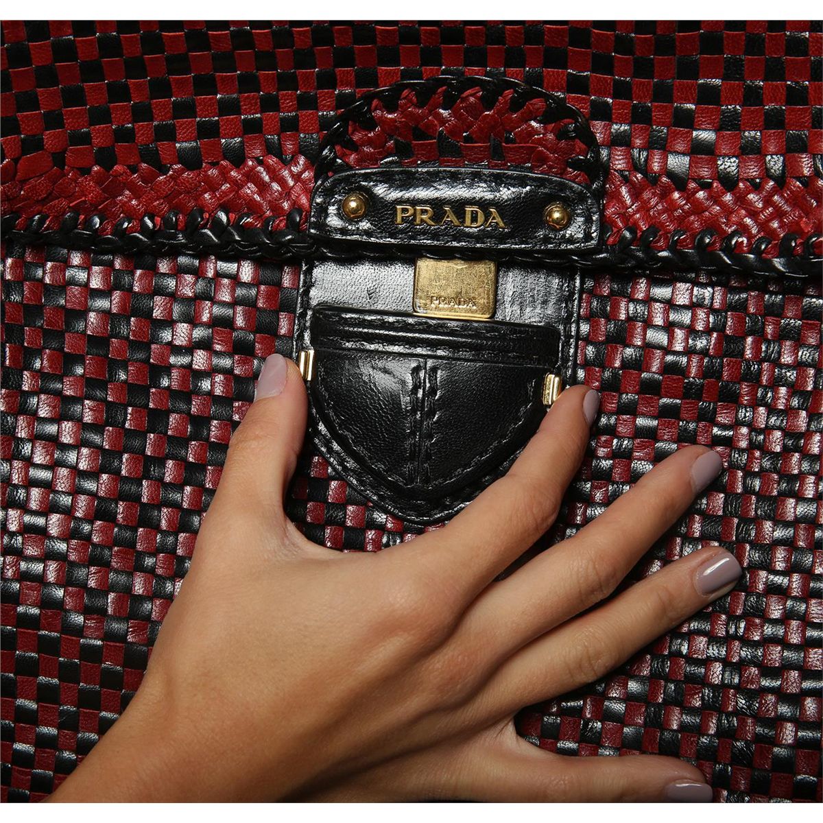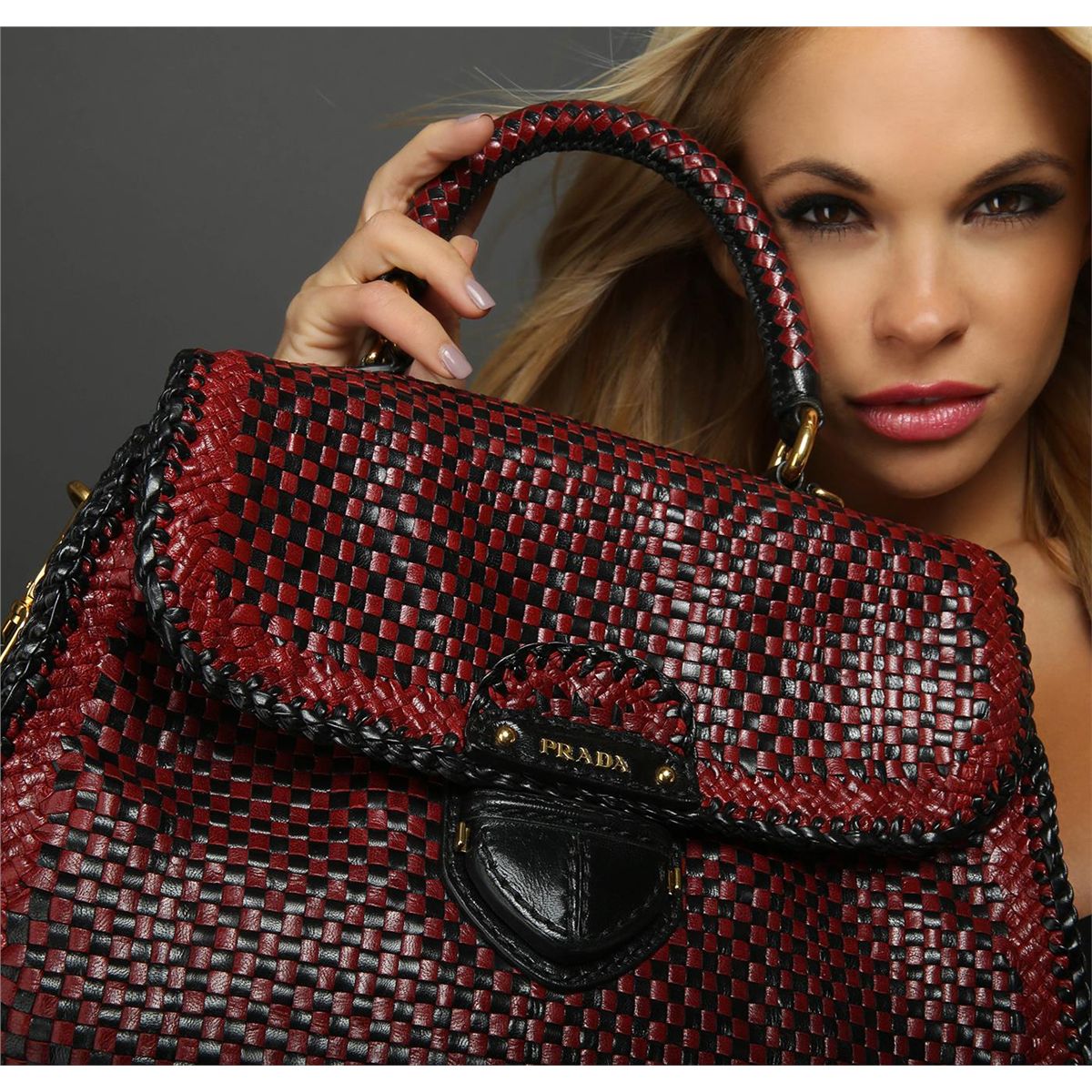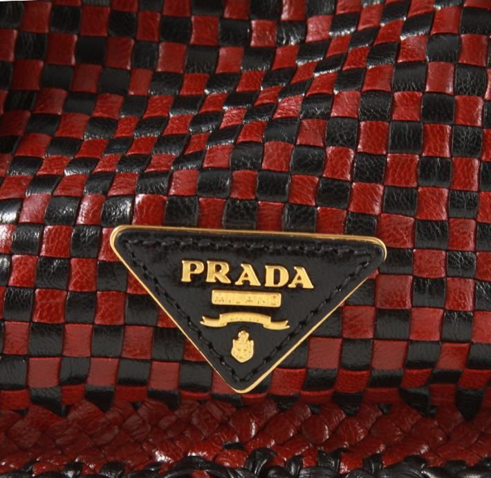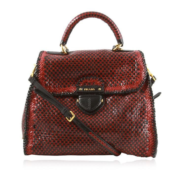 Madras woven bag. Woven goat leather with golden-finished brass hardware. Tubular top handle; removable cross body strap. Flap top with logo detail at center clasp. Inside one zip and two open pockets. Metal feet protect bottom of bag. 11 1/2"H x 6 1/2D. Imported. Celebrity Bag in Rubino & Nero.