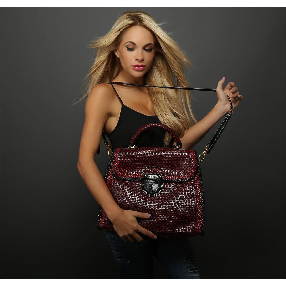 Madras woven bag. Woven goat leather with golden-finished brass hardware. Tubular top handle; removable cross body strap. Flap top with logo detail at center clasp. Inside one zip and two open pockets. Metal feet protect bottom of bag. 11 1/2"H x 6 1/2D. Imported. Celebrity Bag in Rubino & Nero.