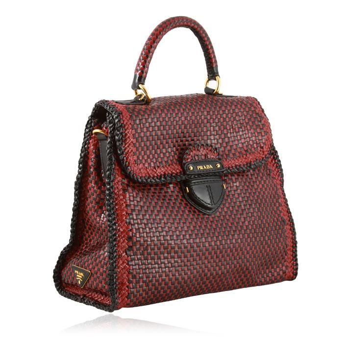 Madras woven bag. Woven goat leather with golden-finished brass hardware. Tubular top handle; removable cross body strap. Flap top with logo detail at center clasp. Inside one zip and two open pockets. Metal feet protect bottom of bag. 11 1/2"H x 6 1/2D. Imported. Celebrity Bag in Rubino & Nero.