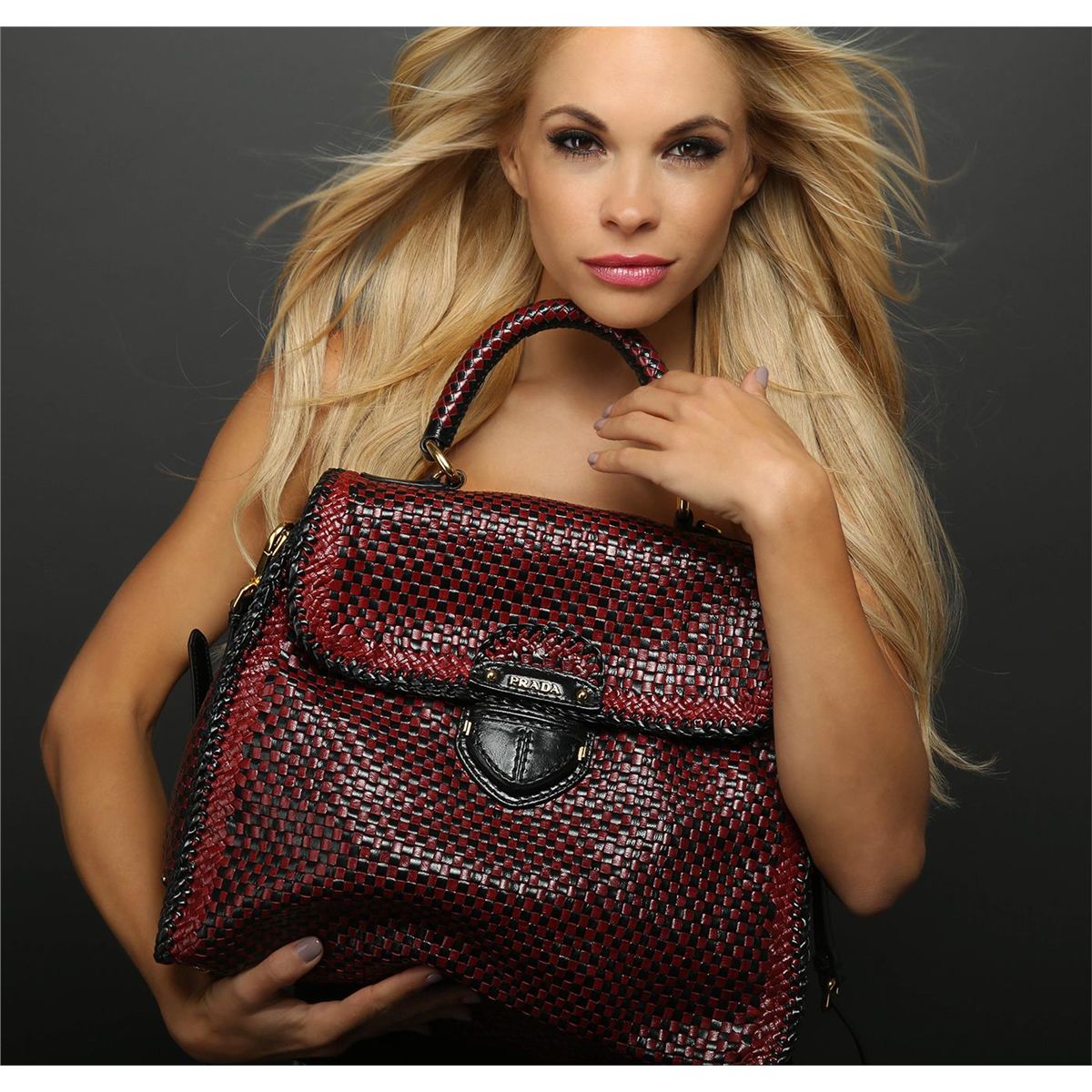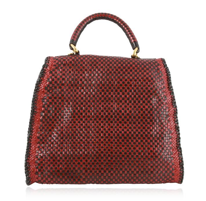 Madras woven bag. Woven goat leather with golden-finished brass hardware. Tubular top handle; removable cross body strap. Flap top with logo detail at center clasp. Inside one zip and two open pockets. Metal feet protect bottom of bag. 11 1/2"H x 6 1/2D. Imported. Celebrity Bag in Rubino & Nero.