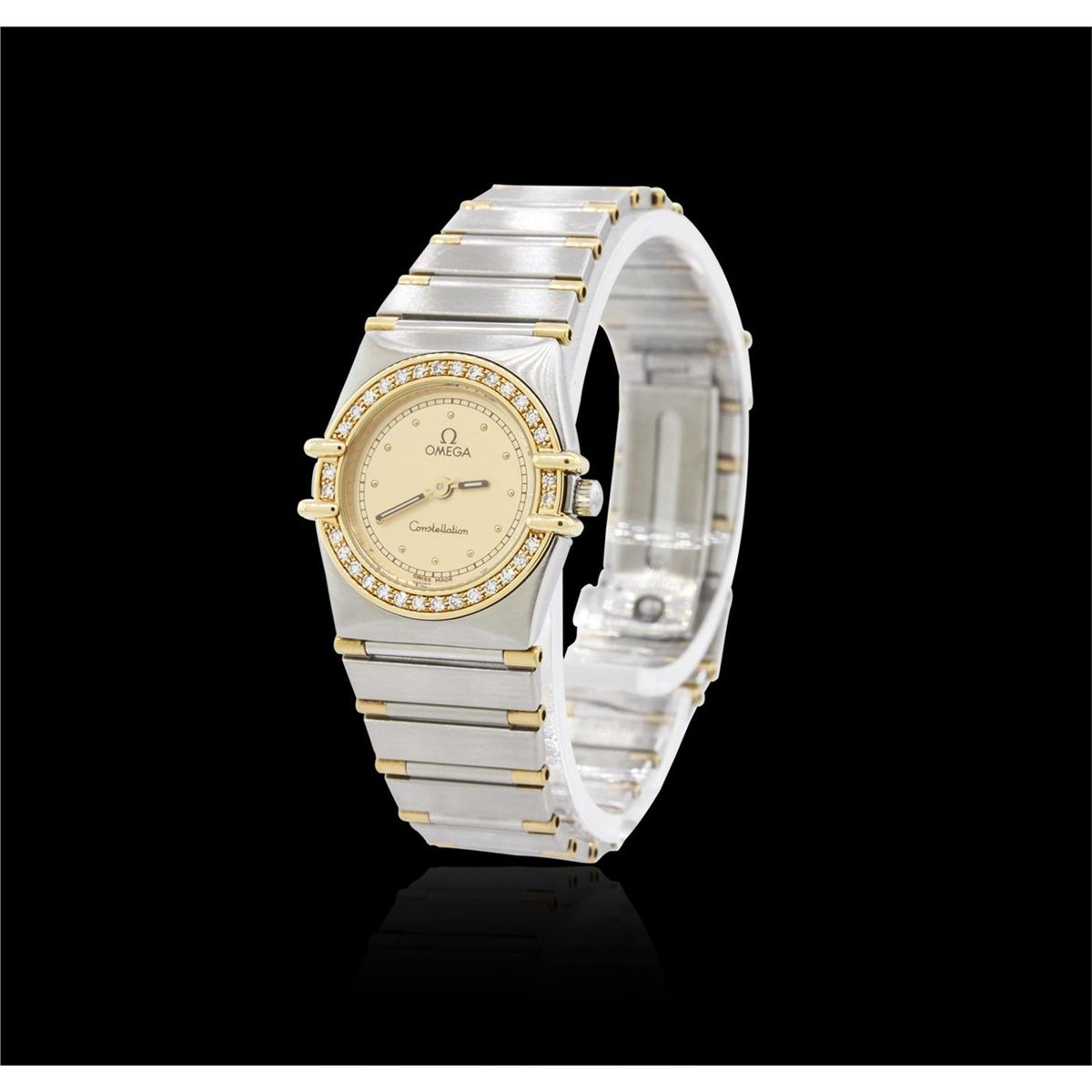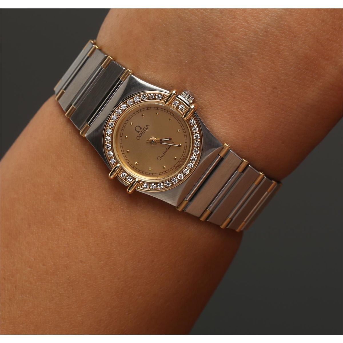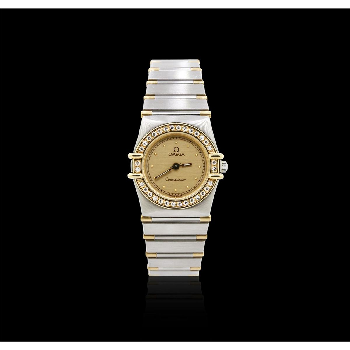 One Omega Constellation wristwatch featuring: Movement: Quartz. Case: Stainless steel and yellow gold. Bezel: Yellow gold set with diamonds; fixed. Dial: Gold tone with luminous hour and second hands; stud markers. Bracelet: Stainless steel with adjustable clasp.