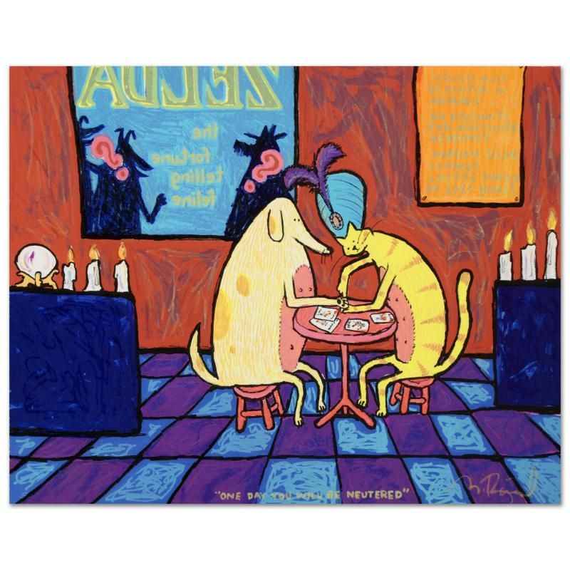 "One Day You'll be Neutered" is a limited edition hand pulled original lithograph on museum quality deckle-edge paper, numbered and hand signed by Matt Rinard. Measures approx. 18" x 14" (image). This lithograph was created on a rare antique Marinoni Voirin French press that dates back to the 1800's. It provides highly pigmented inks that will resist fading and preserve the integrity of the print for more than a lifetime. This process is the most elaborate, costly and effective way to reproduce art while maintaining the brilliance and accuracy of the original creation.