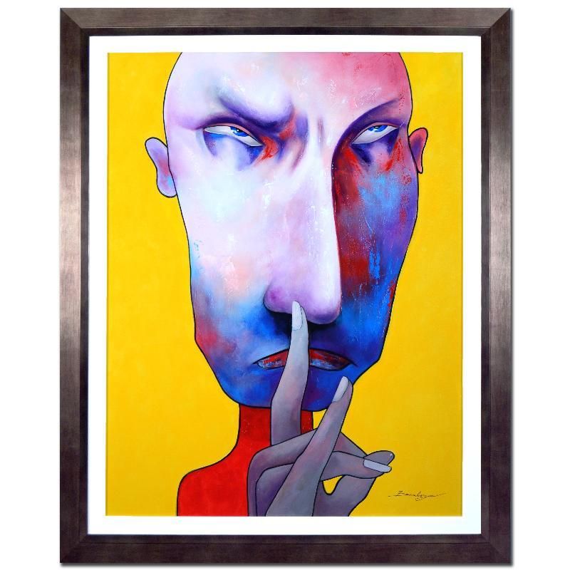 "Let Me Think" is an original mixed media acrylic painting on canvas by Ara "Arbe" Berberyan, hand signed by the artist! This artwork has been custom framed using acid free materials and is ready to hang. Measures approx. 45" x 56.5" (with frame); 35.5" x 47" (image).