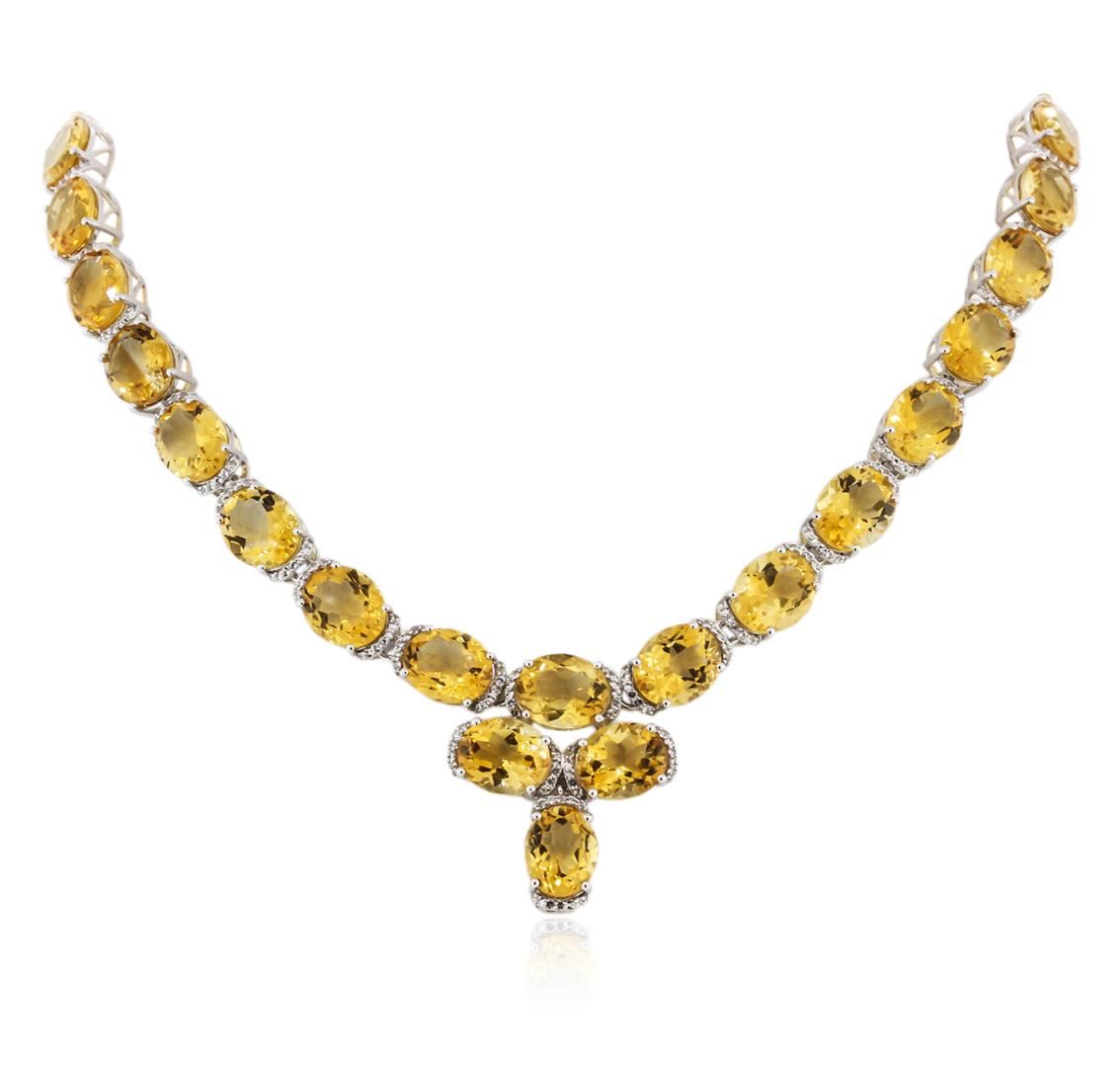 One necklace featuring: platinum plated silver (white) weighing 62.57 grams containing 33 golden oval (faceted) citrine quartz with a total weight of 136.31 ctw. Mmts: 11.85 x 9.95 x 6.20 mm (Avg.). Quality: 9 - Excellent. Also including round (faceted) colorless topaz with a total weight of 2.78 cts. Quality: 10 - Excellent-Fine. GLA Appraised at $8,385.00.