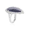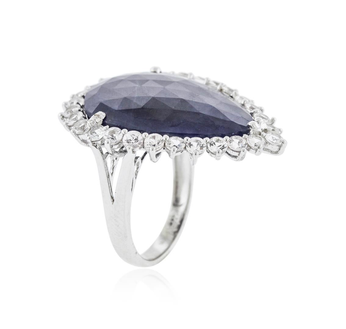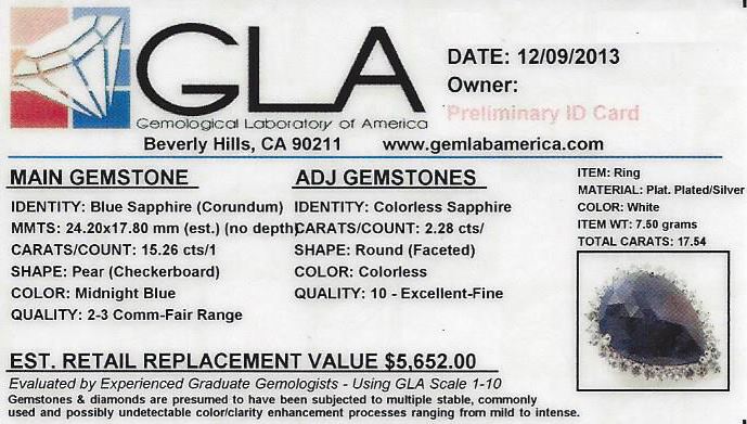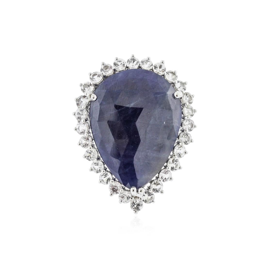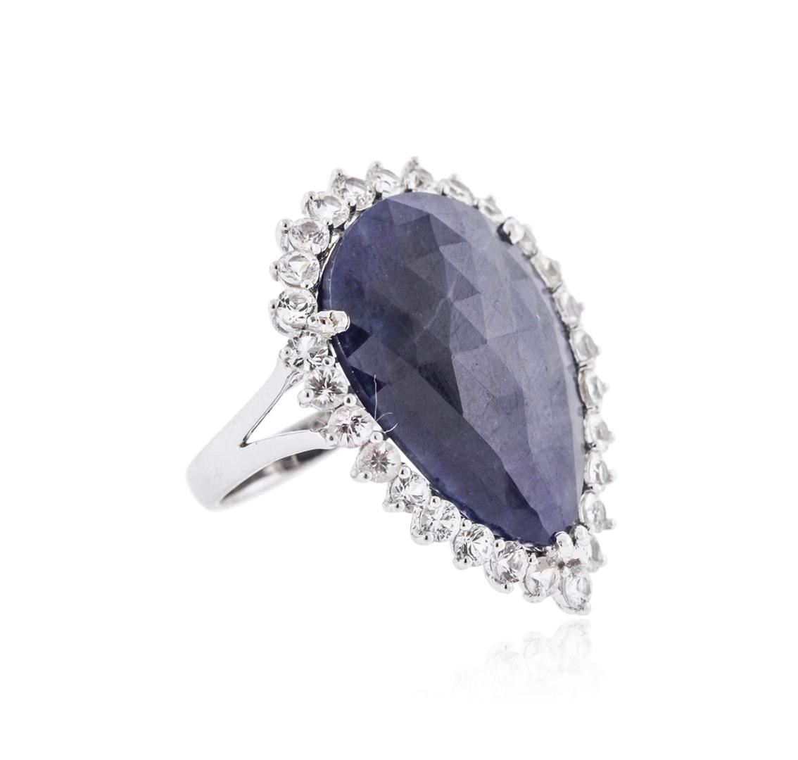 One ring featuring: platinum plated silver (white) weighing 7.50 grams containing 1 pear shaped (checkerboard) midnight blue sapphire with a total weight of 15.26 cts. Mmts: 24.20 x 17.80 mm (est.) (no depth). Quality: 2-3 Comm-Fair Range. Also including round (faceted) colorless sapphires with a total weight of 2.28 cts. Quality: 10 - Excellent-Fine. GLA Appraised at $5,652.00.