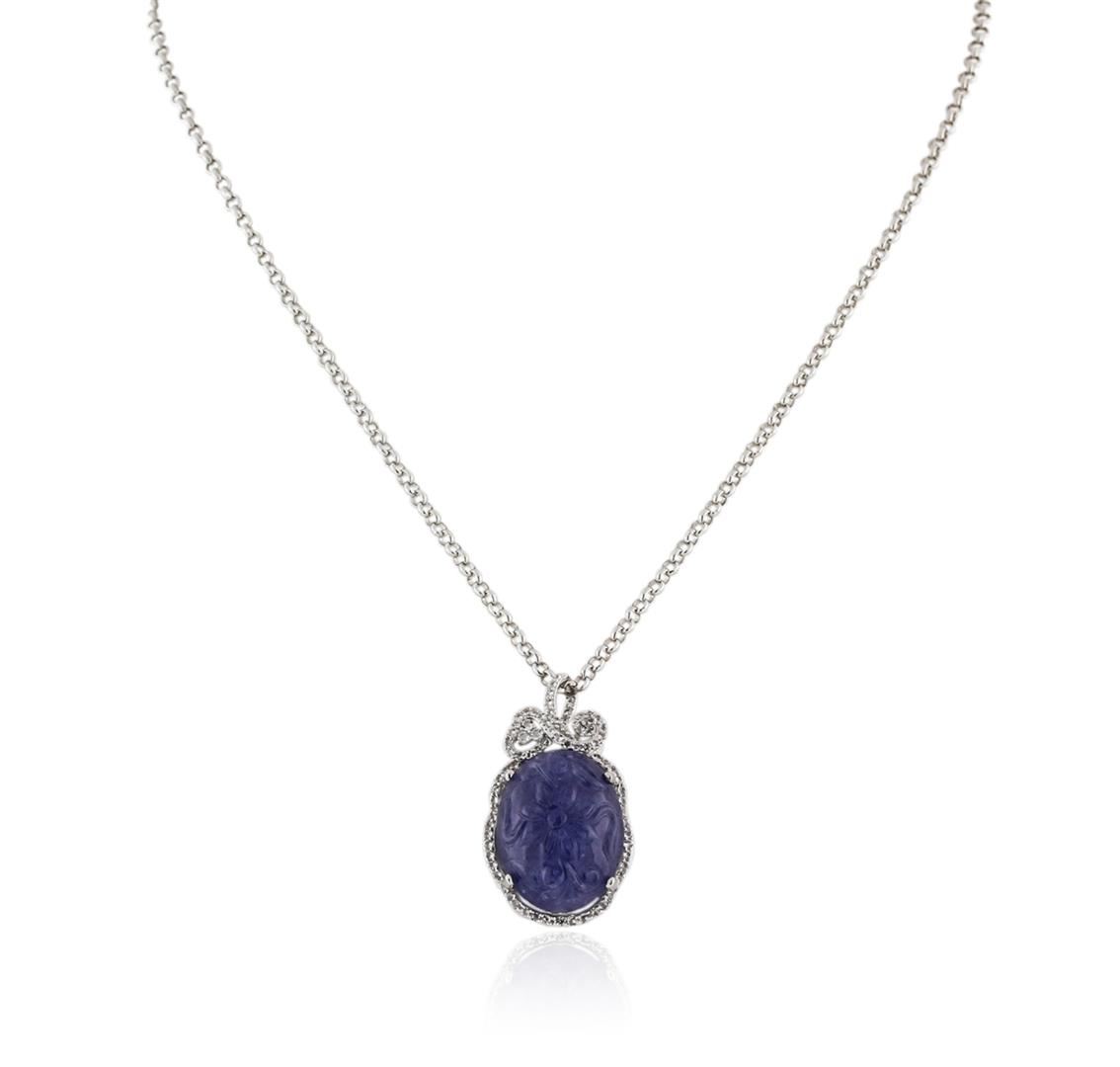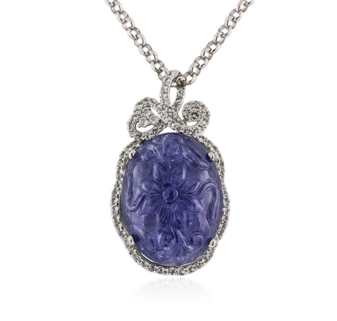 One pendant with chain featuring: platinum plated silver weighing 14.50 grams containing 1 violet blue oval (carved) tanzanite with a total weight of 27.88 cts. Mmts: 22.00 x 17.30 x 8.50 mm (est.). Quality: 7-8 Vy Gd-Ex Range. Also including round (faceted) colorless topaz with a total weight of 0.89 ct. Quality: 10 - Excellent-Fine. GLA Appraised at $6,650.00.