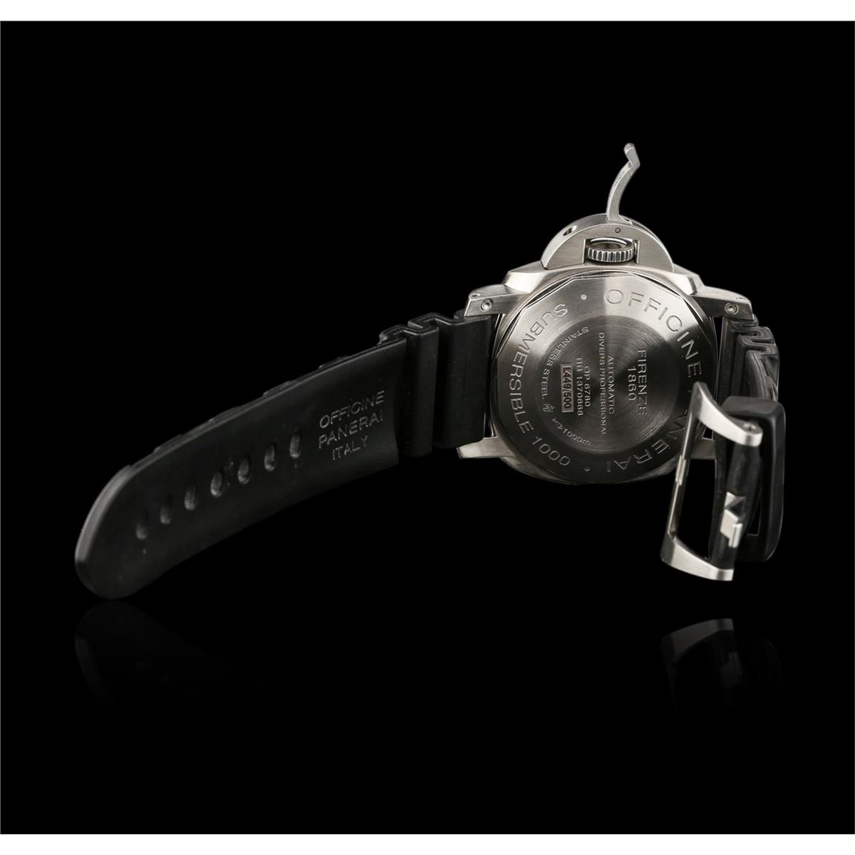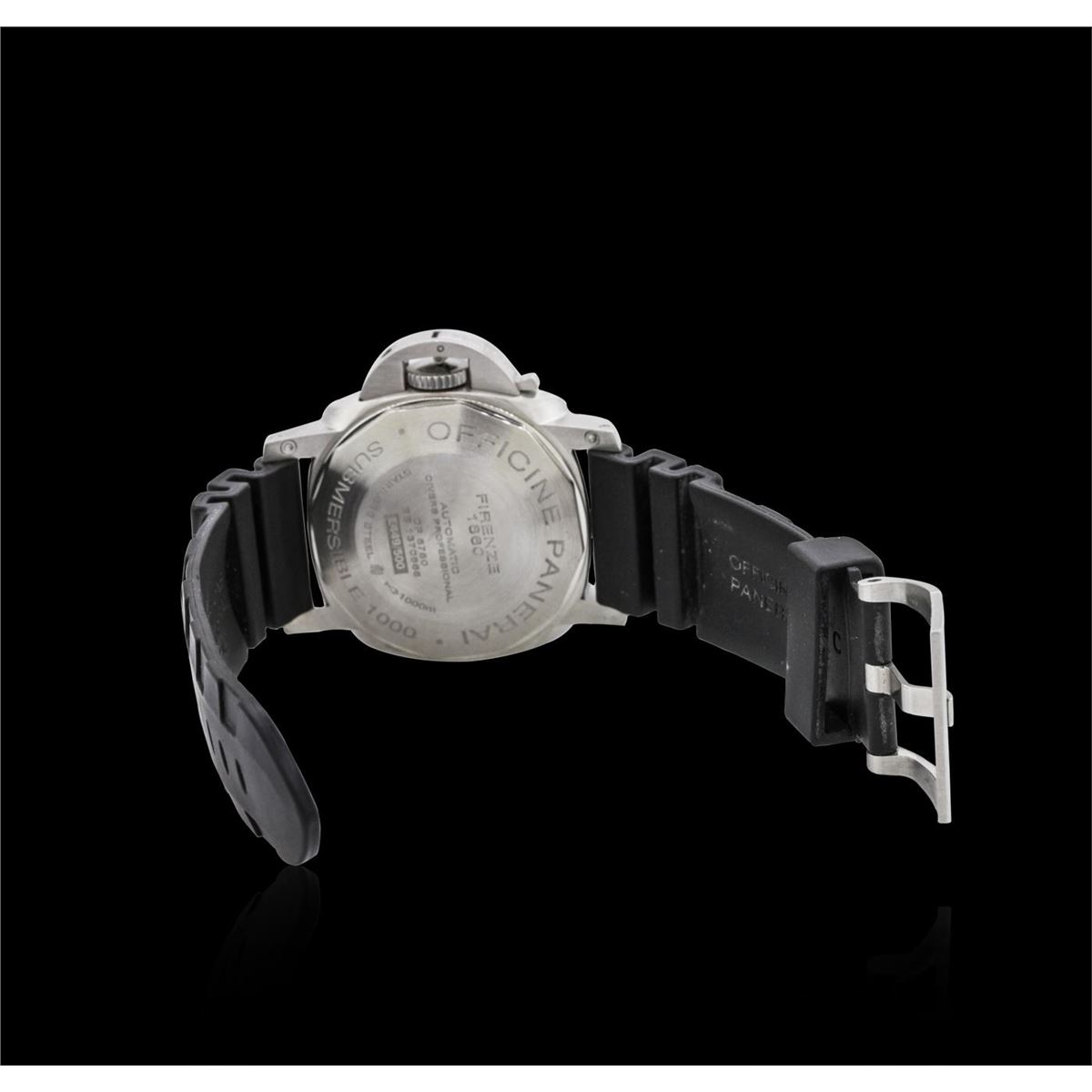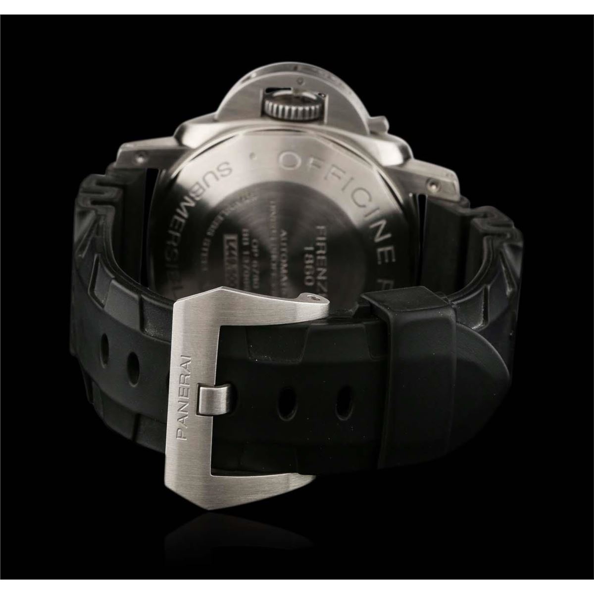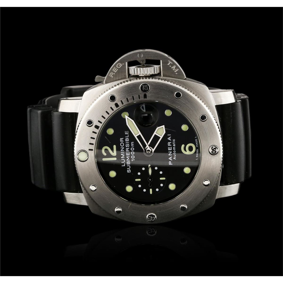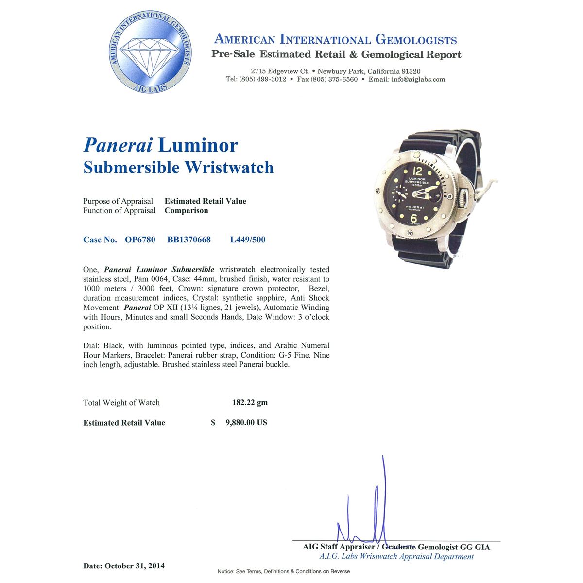 One, Panerai Luminor Submersible wristwatch electronically tested stainless steel, Pam 0064, Case: 44mm, brushed finish, water resistant to 1000 meters / 3000 feet, Crown: signature crown protector, Bezel, duration measurement indices, Crystal: synthetic sapphire, Anti Shock Movement: Panerai OP XII (13ª lignes, 21 jewels), Automatic Winding with Hours, Minutes and small Seconds Hands, Date Window: 3 o'clock position. Dial: Black, with luminous pointed type, indices, and Arabic Numeral Hour Markers, Bracelet: Panerai rubber strap, Condition: G-5 Fine. Nine inch length, adjustable. Brushed stainless steel Panerai buckle. Total Weight of Watch182.22 grams. AIG Appraised at $9,880.00.