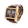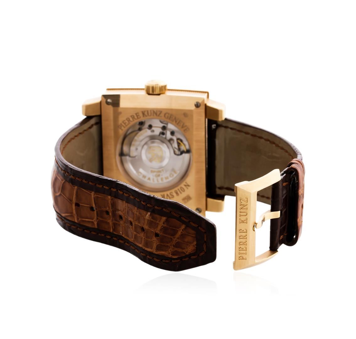 One, Pierre Kunz Seconde Virevoltante Retrograde wristwatch electronically tested 18KT rose gold, Case: 49 x 43mm, Case Sides: vertical raised tapestry pattern, Synthetic Sapphire Exhibition Case Back: engraved with the manufacturers name, ID numbers and the Swiss Hallmark, Fixed Bezel: 18KT rose gold brushed finish, Crystal: synthetic sapphire, Movement: automatic. Power Reserve: 42 hours. Dial: Bronze Sunburst, with separate square dials for Hours, and Minutes, Second Hand Sub Dial: 6 o'clock position, Pierre Kunz Bracelet: saddle stitched alligator strap with an 18KT rose gold signed buckle clasp, Condition: G-7 Near Mint. Eight inch length, adjustable. Weight of Watch150.26 grams. AIG Appraised at $26,000.00.