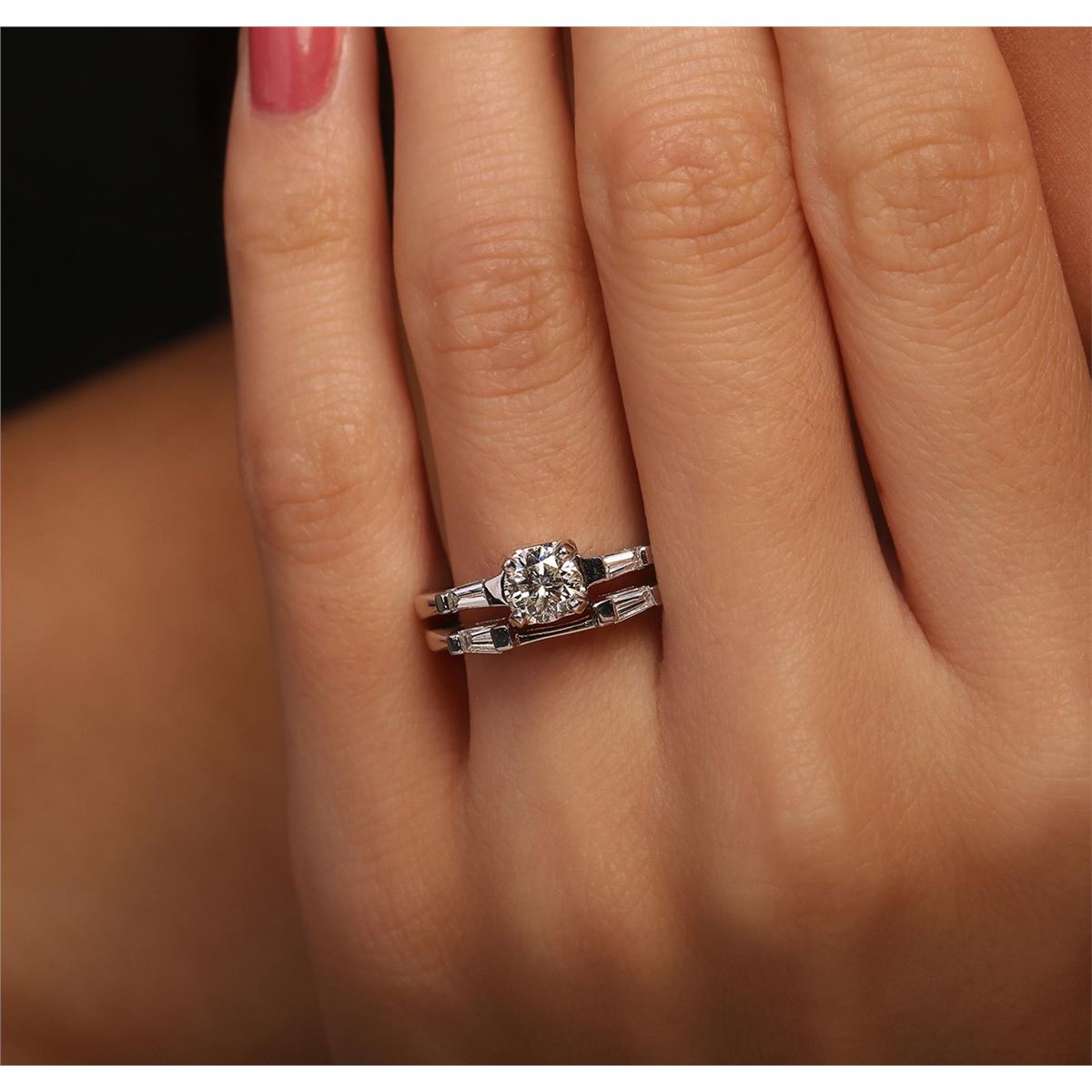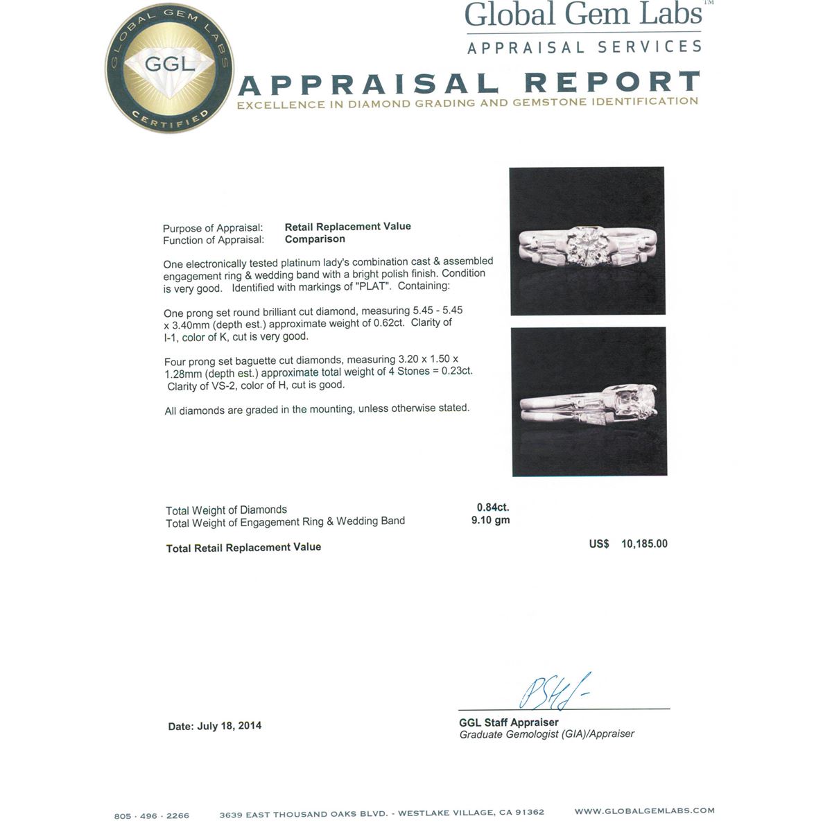 One electronically tested platinum Ladies combination cast & assembled engagement ring & wedding band with a bright polish finish. Condition is very good. Identified with markings of "PLAT". Containing: One prong set round brilliant cut diamond, measuring 5.45 - 5.45 x 3.40mm (depth est.) approximate weight of 0.62ct. Clarity: I-1. Color: K, Cut is Very Good. Four prong set baguette cut diamonds, measuring 3.20 x 1.50 x 1.28mm (depth est.) approximate. Total Weight of 4 Stones = 0.23ct. Clarity: VS-2. Color: H, Cut is Good. All diamonds are graded in the mounting, unless otherwise stated. Total Weight of Diamonds 0.84ct. Total Weight of Engagement Ring & Wedding Band 9.10 grams.. GGL Appraised at $10,185.00.