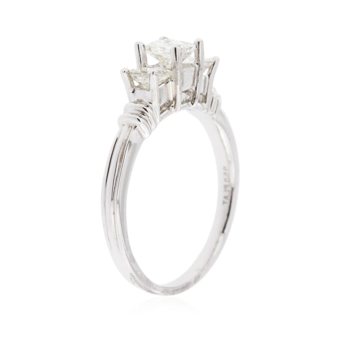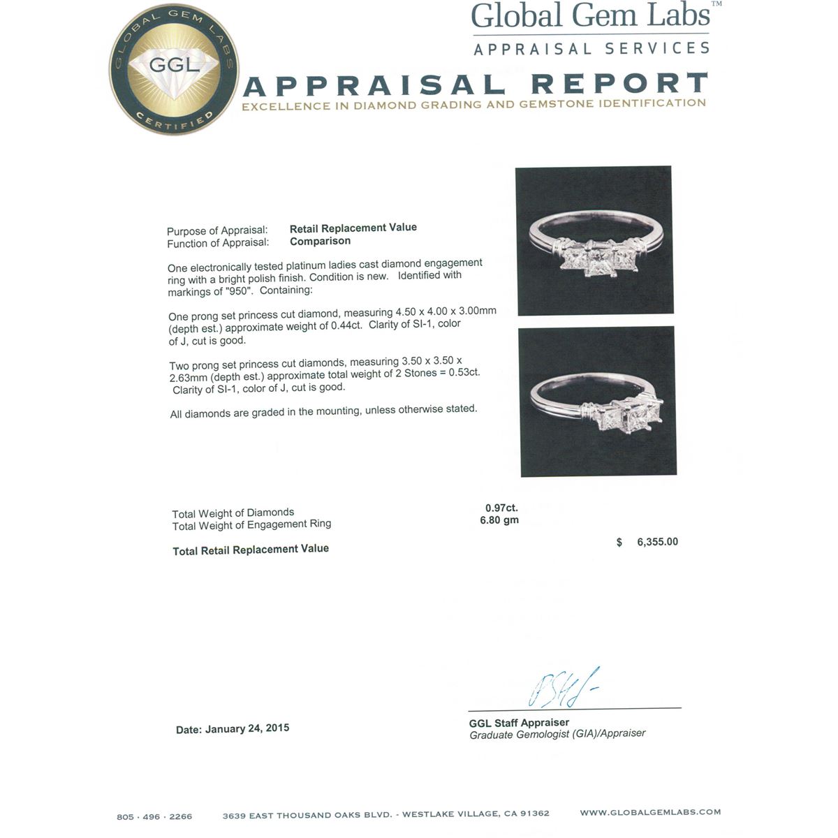 One electronically tested platinum ladies cast diamond engagement ring with a bright polish finish. Identified with markings of "950". Condition is new. Containing: One prong set princess cut diamond, measuring 4.50 x 4.00. x 3.00.mm (depth est.) approximate weight of 0.44ct. Clarity: SI-1. Color: J, Cut is Good. Two prong set princess cut diamonds, measuring 3.50 x 3.50 x 2.63mm (depth est.) approximate total weight of 2 Stones = 0.53ct. Clarity: SI-1. Color: J, Cut is Good. All diamonds are graded in the mounting, unless otherwise stated. Total Weight of Diamonds 0.97ct. Total Weight of Engagement Ring 6.80 grams. GGL Appraised at $6,355.00.