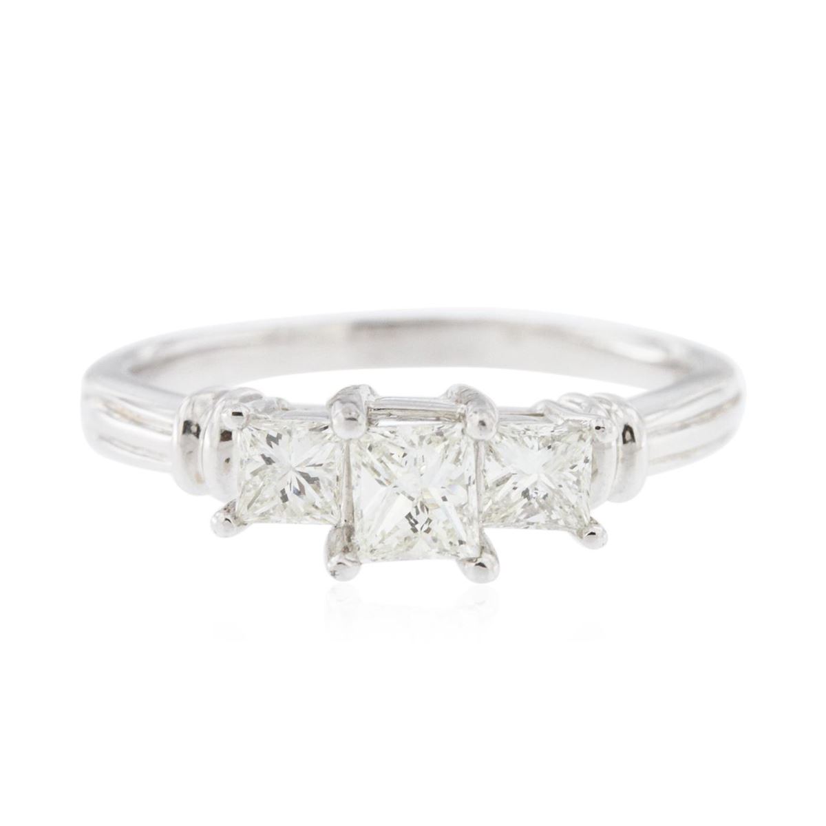 One electronically tested platinum ladies cast diamond engagement ring with a bright polish finish. Identified with markings of "950". Condition is new. Containing: One prong set princess cut diamond, measuring 4.50 x 4.00. x 3.00.mm (depth est.) approximate weight of 0.44ct. Clarity: SI-1. Color: J, Cut is Good. Two prong set princess cut diamonds, measuring 3.50 x 3.50 x 2.63mm (depth est.) approximate total weight of 2 Stones = 0.53ct. Clarity: SI-1. Color: J, Cut is Good. All diamonds are graded in the mounting, unless otherwise stated. Total Weight of Diamonds 0.97ct. Total Weight of Engagement Ring 6.80 grams. GGL Appraised at $6,355.00.