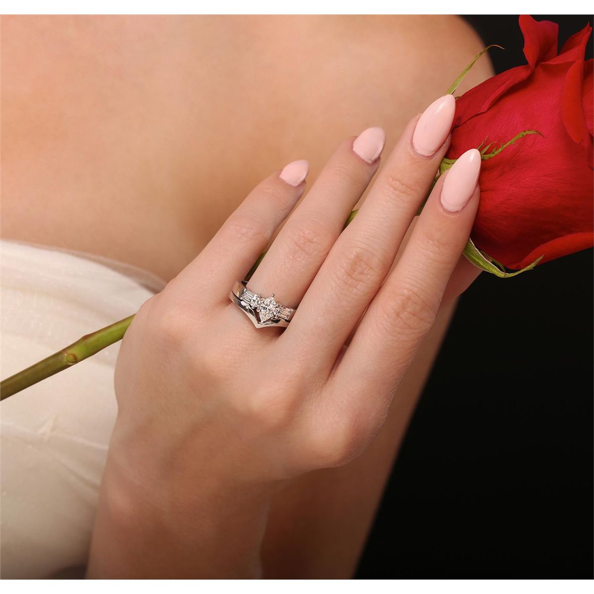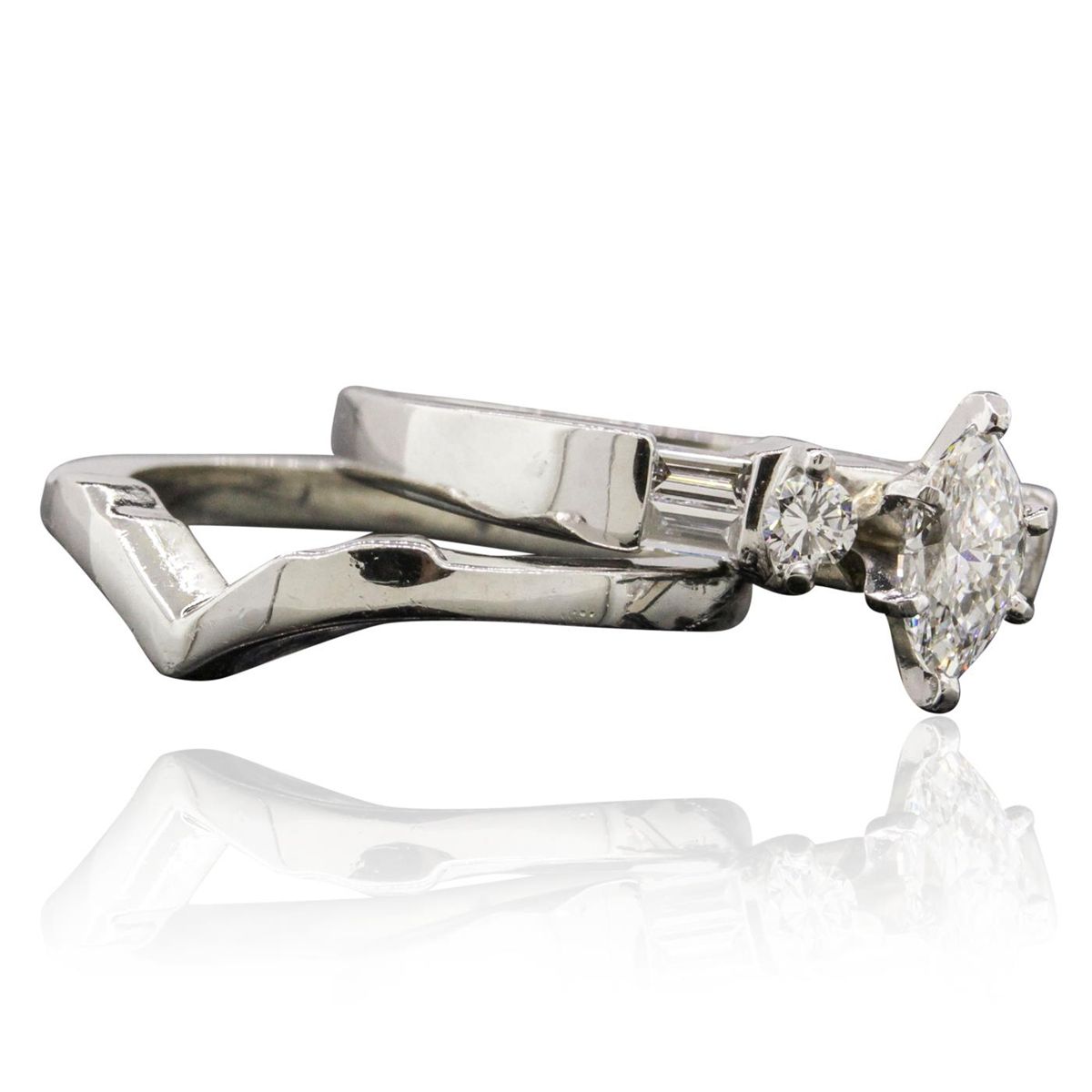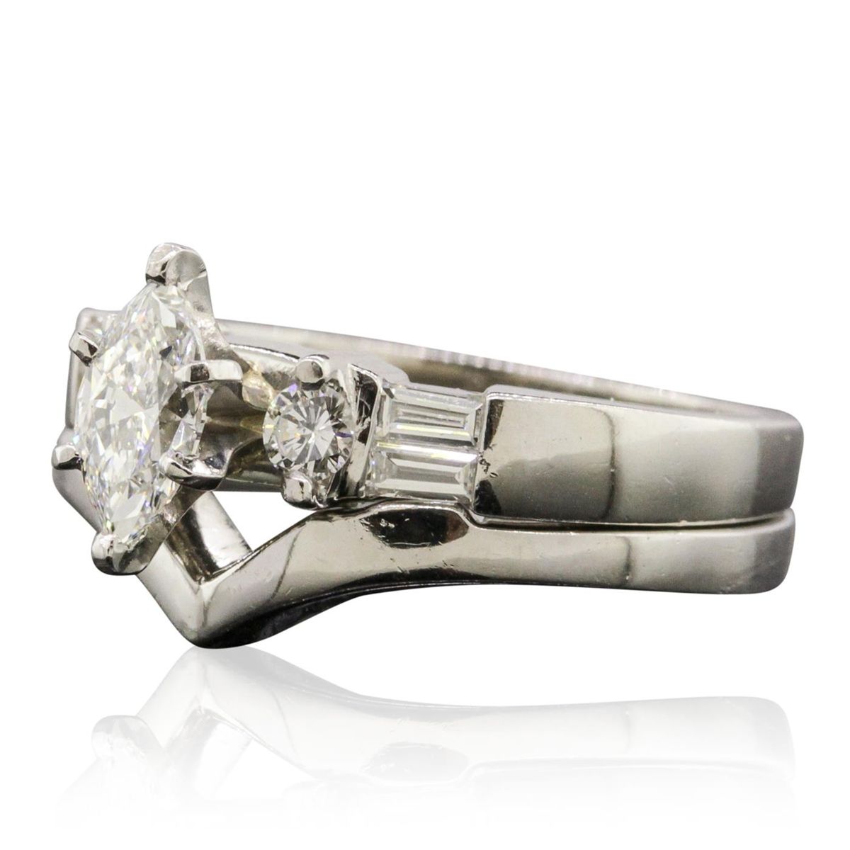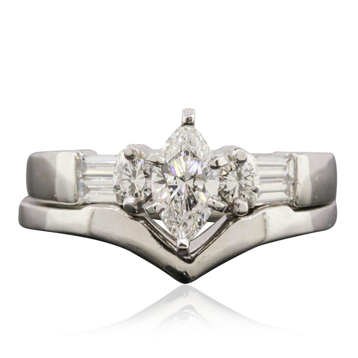 One electronically tested platinum ladies cast & assembled diamond wedding set. Condition is new, good workmanship. The wedding set includes a diamond engagement ring and a wedding band. The engagement ring features a diamond supported by diamond set shoulders. The set is completed by a matching wedding band. Each ring is completed by a two millimeter wide band. Identified with markings of "PLAT". Containing: One prong set marquise shaped cut diamond, measuring 7.50 x 4.20 x 2.65mm (depth est.), 4.00.%. GTCF approximate weight of 0.60ct. Graded in the setting. Clarity: VS-1. Color: 63.1%. Table 59.5%. Two prong set round brilliant cut diamonds, measuring 2.90 - 2.80 x 1.71mm (depth est.) approximate. Total Weight of 2 Stones = 0.18ct. Color & clarity grade are an average for the pair. Graded in the setting. Clarity: SI-1. Color: G Four channel set baguette cut diamonds, measuring from 3.10 x 1.50 x 1.05mm (depth est.) to 3.20 x 1.60 x 1.12mm (depth est.) approximate. Total Weight of 4 Stones = 0.19ct. Graded in the setting. Clarity: VS-1 to VS-2. Color: G - H. Total Weight of Diamonds 0.97ct. Total Weight of Wedding Set 12.76 grams. AIG Appraised at $11,690.00.