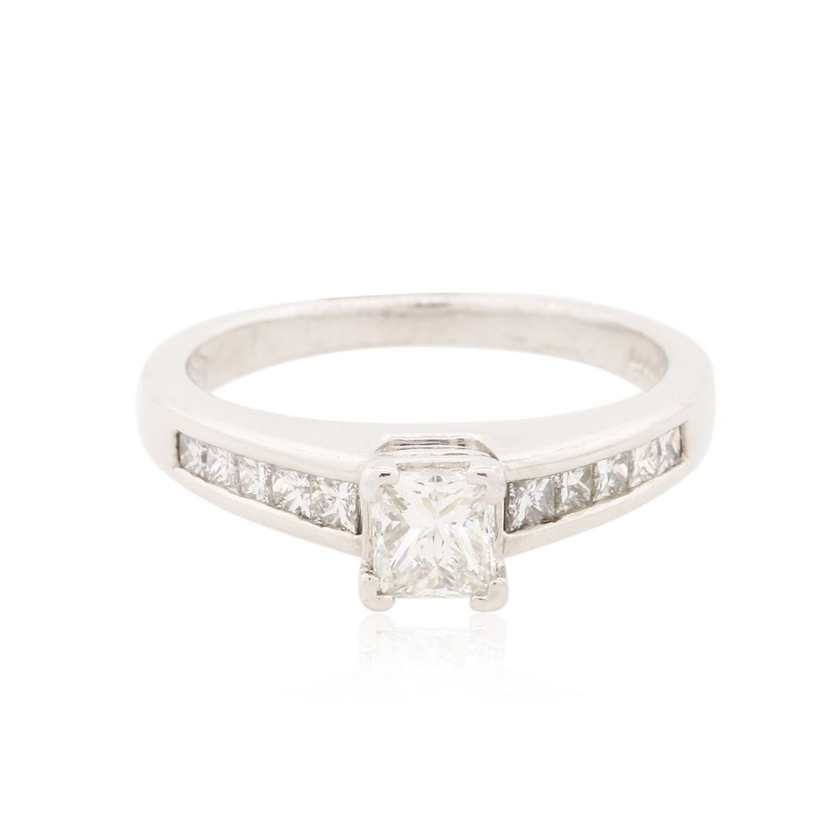 One ring featuring: platinum weighing 5.40 grams containing one princess cut center diamond and channel set princess cut side diamonds with a total diamond weight of 1.00ct.