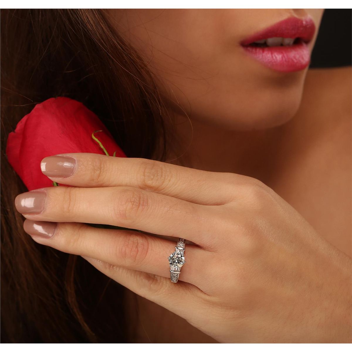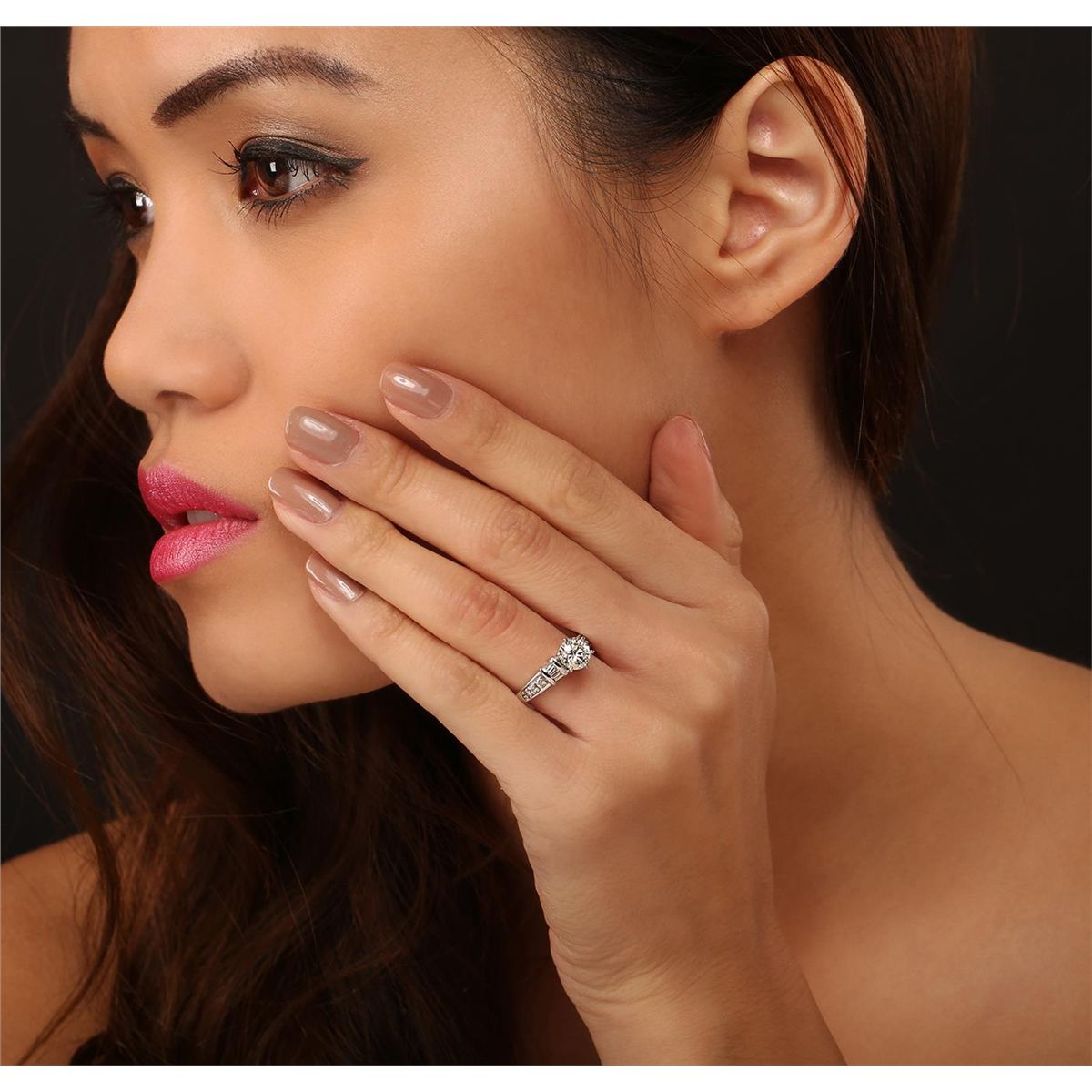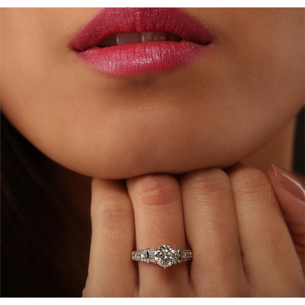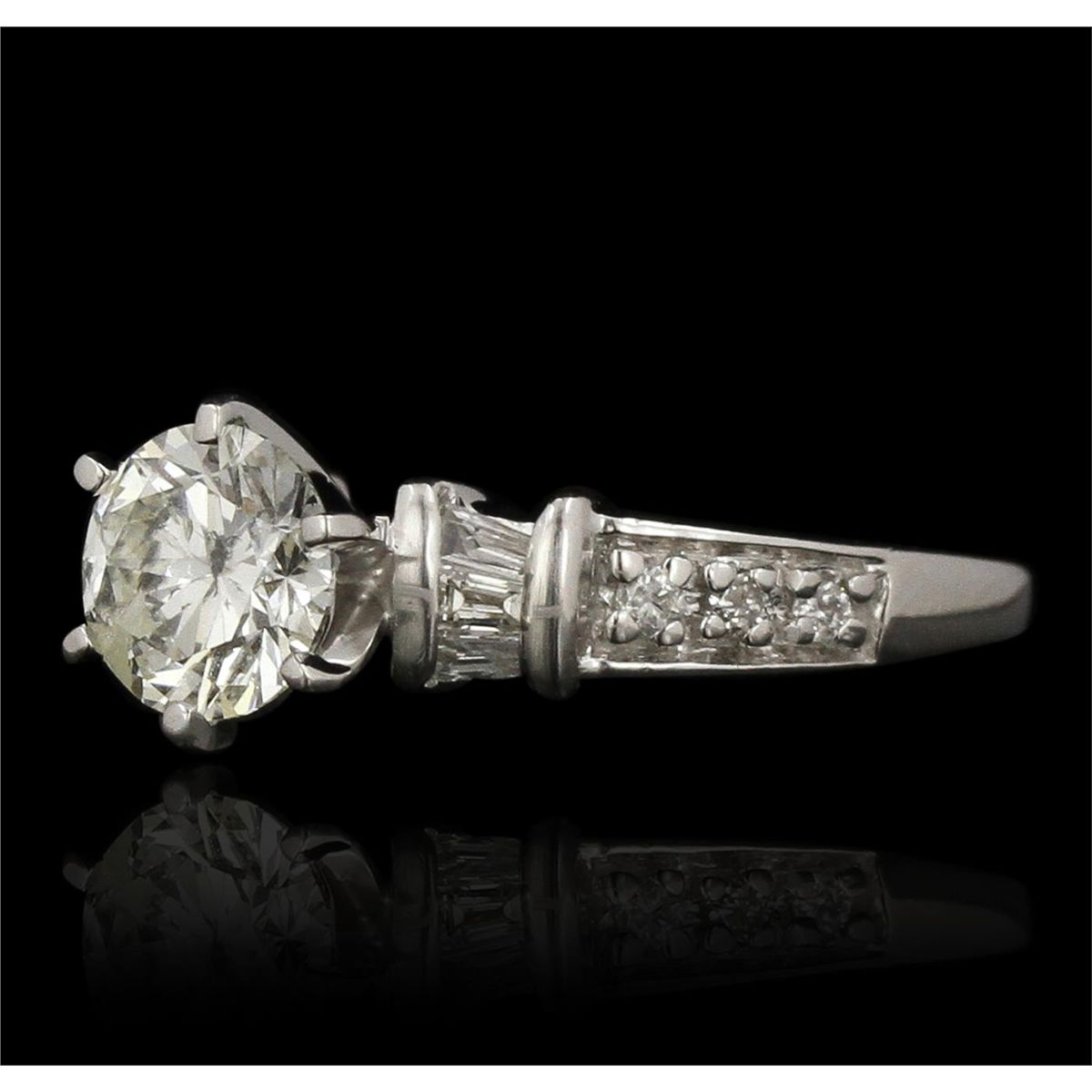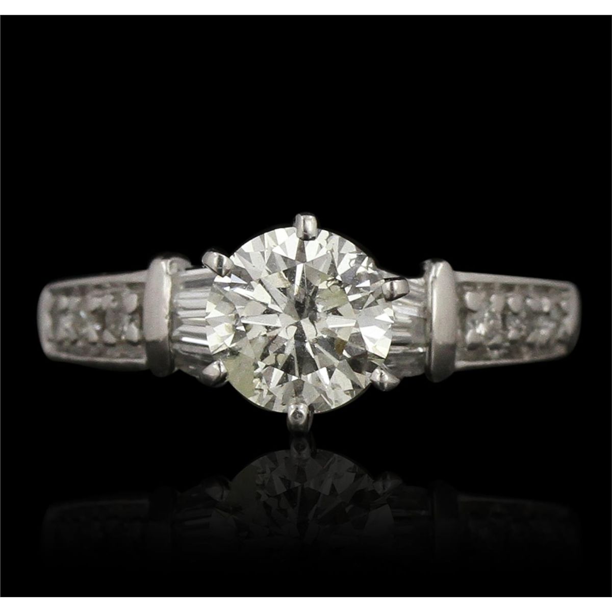 One electronically tested platinum ladies cast & assembled diamond unity ring with a bright polish finish. Condition is good. The featured diamond is cathedral set supported by diamond set shoulders, completed by a one and one-half millimeter wide band. Identified with markings of "PT 950". Containing: One prong set round brilliant cut diamond, measuring 6.40 - 6.35 x 4.00mm (depth est.) approximate weight of 1.02ct. Graded in the setting. Clarity I-1. Color K. Depth 62.7%. Table 64.3%. Twelve prong set round brilliant & baguette cut diamonds approximate total weight of 12 Stones = 0.25ct. Graded in the setting. Clarity SI-1 to I-1. Color G - I. Total Weight of Diamonds 1.27ct. Total Weight of Ring 4.27gm. AIG Appraised at $10,945.00.