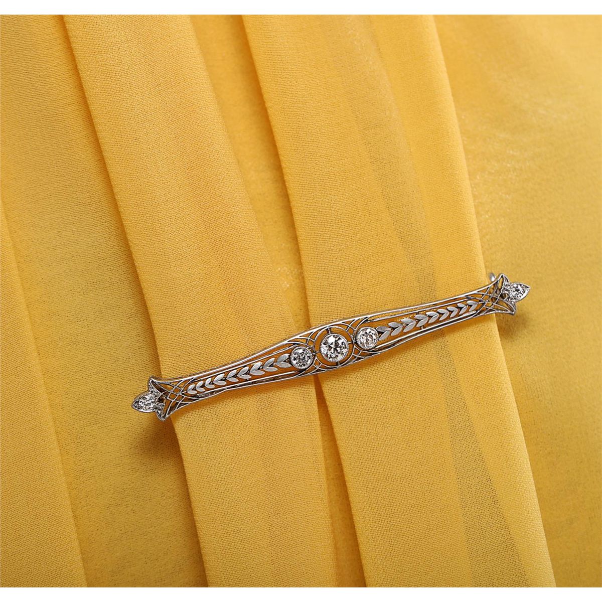 platinum 1.04ctw Diamond Brooch A6626. One electronically tested platinum ladies cast & assembled diamond brooch. Two and three-quarter inch length brooch features a series of diamonds set within a stylized wheat design lattice gallery supported by a diamond accent on either end, completed by a 14KT yellow gold horizontally placed pin. Bright polish finish with milgrain detailing.The brooch reminiscent of the jewelry designs from the Art Deco Period. The Paris Exposition of Decorative Arts and Modern Manufacturers in 1925 gave the movement its name. The Art Deco Period is characterized with jewelry designs composed of bold geometric designs, & cubism. Condition is good. Containing: One bezel set Old European cut diamond, measuring 4.50 - 4.50 x 2.65mm (depth est.) approximate weight of 0.42ct. Cutting style circa late 19th century. Graded in the setting. Clarity: SI-1. Color: H Two bezel set Old European cut diamonds, measuring 3.40 - 3.30 x 2.00mm (depth est.) approximate. Total Weight of 2 Stones = 0.37ct. Cutting style circa late 19th century. Graded in the setting. Clarity: VS-2 to SI-1. Color: G - H Two bead set Old European cut diamonds, measuring 2.80 - 2.70 x 1.60mm (depth est.) approximate. Total Weight of 2 Stones = 0.25ct. Graded in the setting. Clarity: VS-1 to VS-2. Color: G - H. Total Weight of Diamonds 1.04ct. AIG Appraised at $7,260.00.
