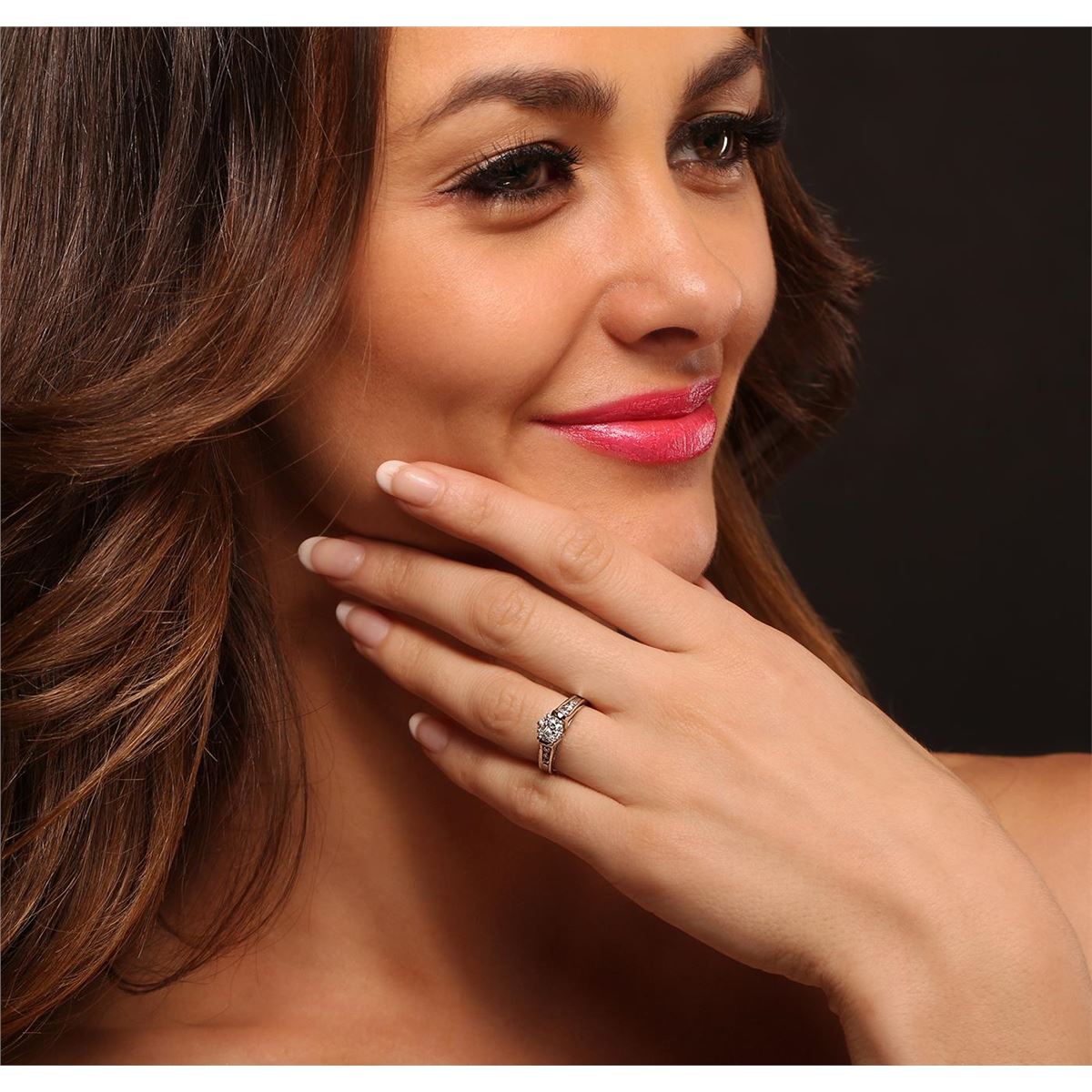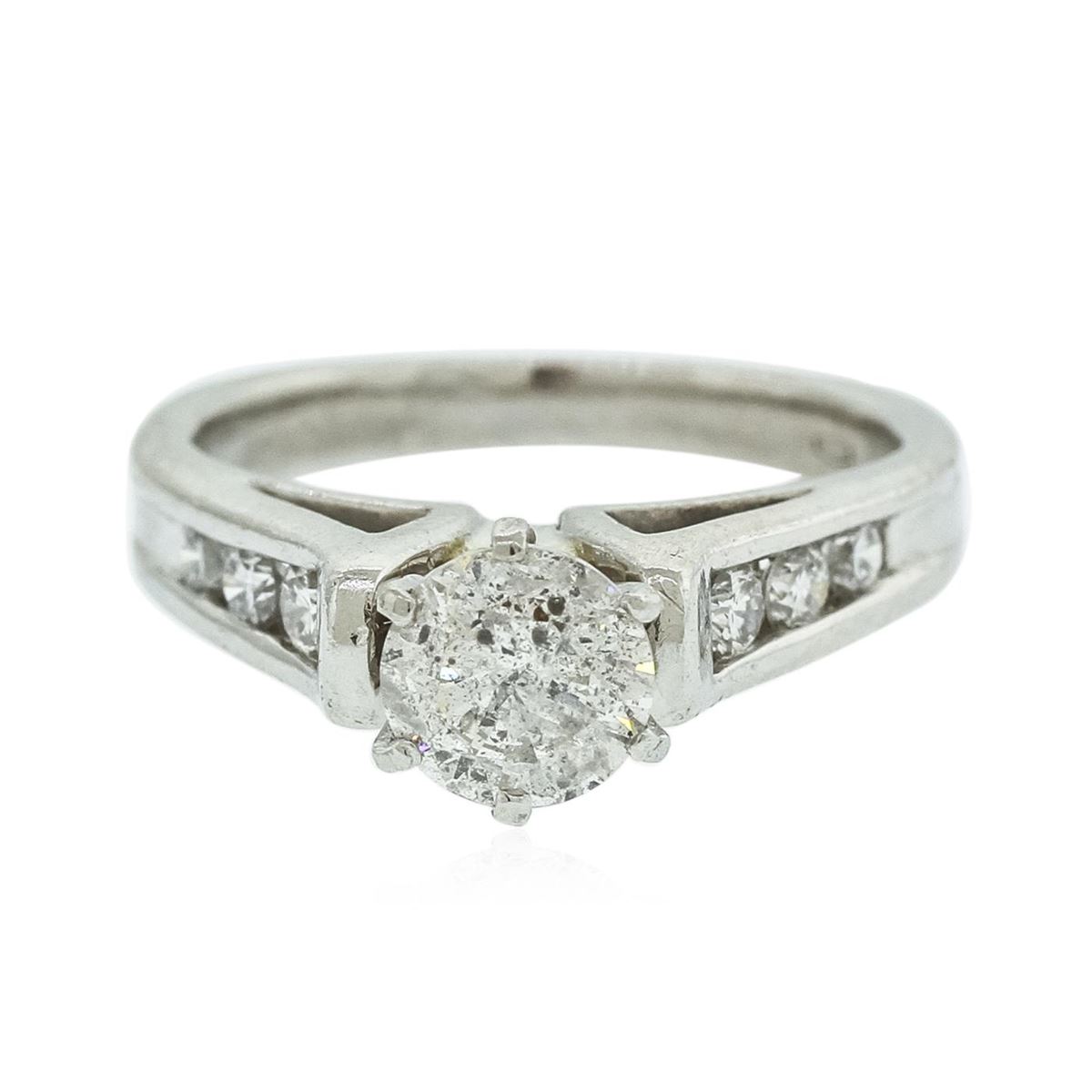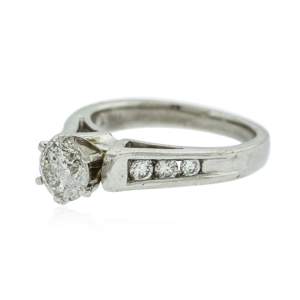 One electronically tested platinum ladies cast & assembled diamond unity ring with a bright polish finish. Condition is good. The featured diamond is cathedral set supported by diamond set shoulders, completed by a two millimeter wide band. Identified with markings of "PT900". Containing: One prong set round brilliant cut diamond, measuring 5.75 - 5.70 x 3.90mm (depth est.) approximate weight of 0.81ct. Faint brown secondary color throughout. Graded in the setting. Clarity: I-2. Color: JDepth 68.1%. Table 59.3%. Six channel set round brilliant cut diamonds, measuring 2.40 - 2.00 x 1.32mm (depth est.) approximate. Total Weight of 6 Stones = 0.33ct. Graded in the setting. Clarity: SI-1 to SI-2. Color: H - J. Total Weight of Diamonds 1.14ct. Total Weight of Ring 6.75 grams. AIG Appraised at $8,050.00.