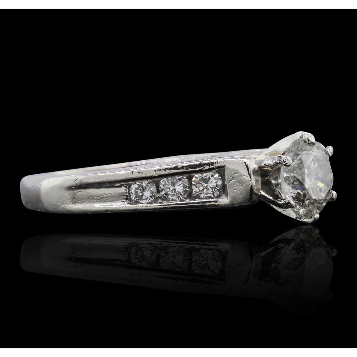 One electronically tested platinum ladies cast & assembled diamond unity ring with a bright polish finish. Condition is good. The featured diamond is cathedral set supported by diamond set shoulders, completed by a two millimeter wide band. Identified with markings of "PT900". Containing: One prong set round brilliant cut diamond, measuring 5.75 - 5.70 x 3.90mm (depth est.) approximate weight of 0.81ct. Faint brown secondary color throughout. Graded in the setting. Clarity: I-2. Color: JDepth 68.1%. Table 59.3%. Six channel set round brilliant cut diamonds, measuring 2.40 - 2.00 x 1.32mm (depth est.) approximate. Total Weight of 6 Stones = 0.33ct. Graded in the setting. Clarity: SI-1 to SI-2. Color: H - J. Total Weight of Diamonds 1.14ct. Total Weight of Ring 6.75 grams. AIG Appraised at $8,050.00.