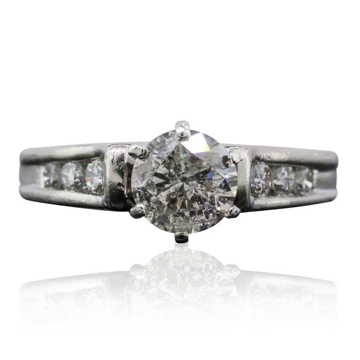 One electronically tested platinum ladies cast & assembled diamond unity ring with a bright polish finish. Condition is good. The featured diamond is cathedral set supported by diamond set shoulders, completed by a two millimeter wide band. Identified with markings of "PT900". Containing: One prong set round brilliant cut diamond, measuring 5.75 - 5.70 x 3.90mm (depth est.) approximate weight of 0.81ct. Faint brown secondary color throughout. Graded in the setting. Clarity: I-2. Color: JDepth 68.1%. Table 59.3%. Six channel set round brilliant cut diamonds, measuring 2.40 - 2.00 x 1.32mm (depth est.) approximate. Total Weight of 6 Stones = 0.33ct. Graded in the setting. Clarity: SI-1 to SI-2. Color: H - J. Total Weight of Diamonds 1.14ct. Total Weight of Ring 6.75 grams. AIG Appraised at $8,050.00.
