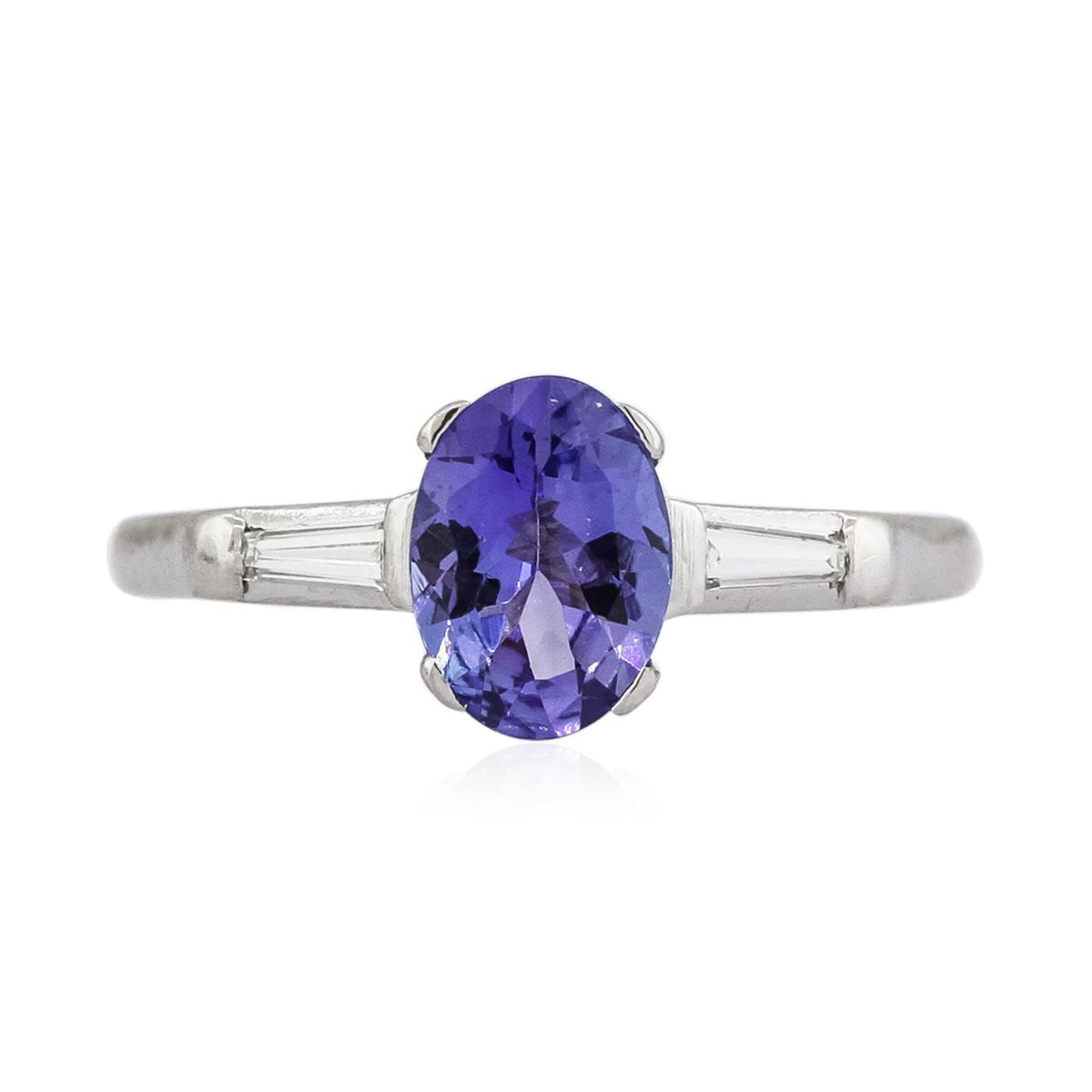 One electronically tested platinum ladies cast tanzanite and diamond ring with a bright polish finish. Identified with markings of "10%. IRID PLAT". Condition is new. Containing: One prong set oval modified brilliant cut natural tanzanite, measuring 8.00 x 5.70 x 3.71mm, approximate weight of 1.19ct., clarity is eye clean, type I, medium light, very slightly grayish, violet color, (GIA V 4/3), cut is good. Two prong set baguette cut (tapered) diamonds, measuring 3.50 x 1.40 x 1.19mm (depth est.) approximate total weight of 2 Stones = 0.11ct. Clarity: SI-1. Color: H, Cut is Good. Colored gemstones are presumed to have been subjected to commonly used enhancement processes. All diamonds and colored gemstones are graded in the mounting, unless otherwise stated. Total Weight of Colored Stones 1.19ct. Total Weight of Diamonds 0.11ct. Total Weight of Ring 3.80 grams. GGL Appraised at $2,455.00.