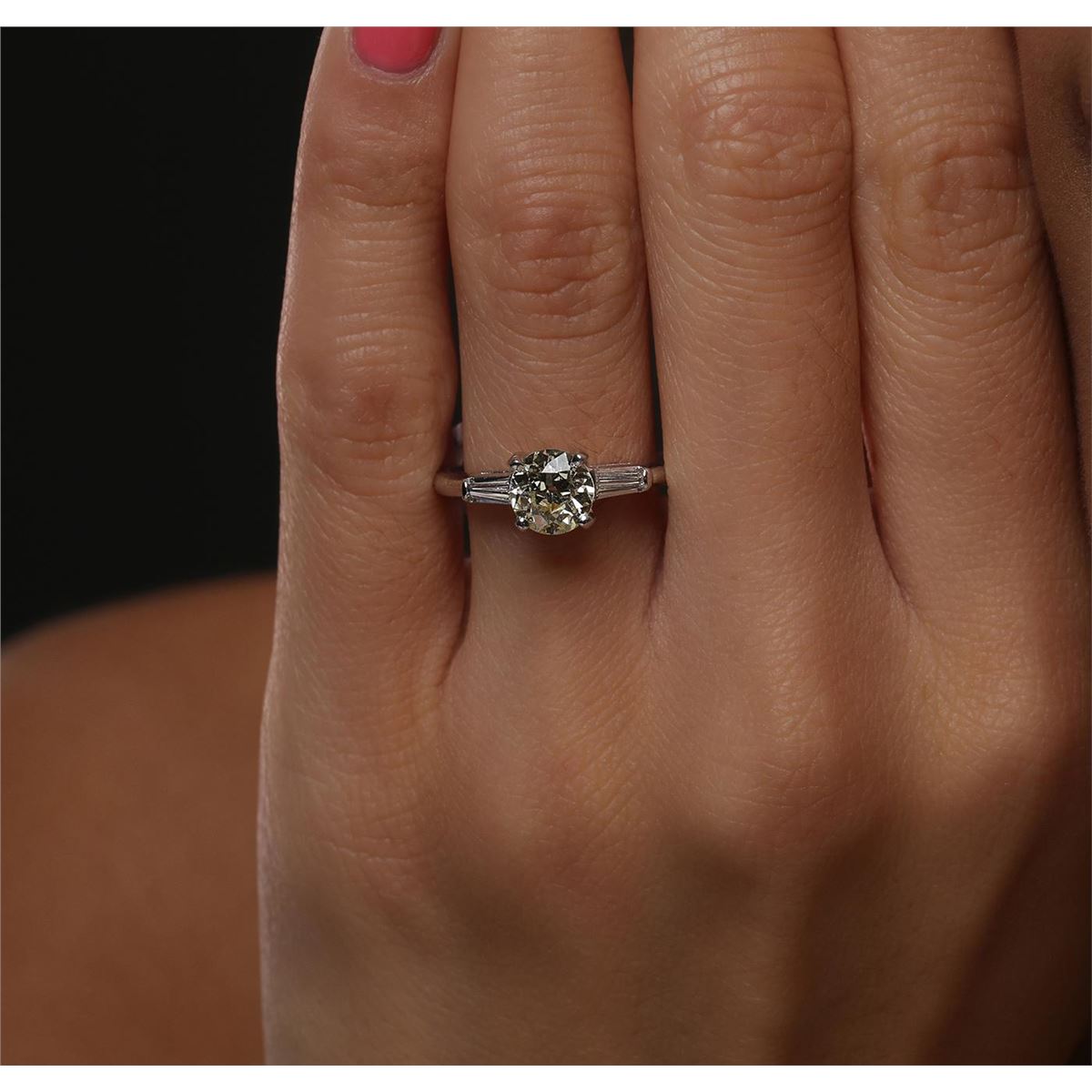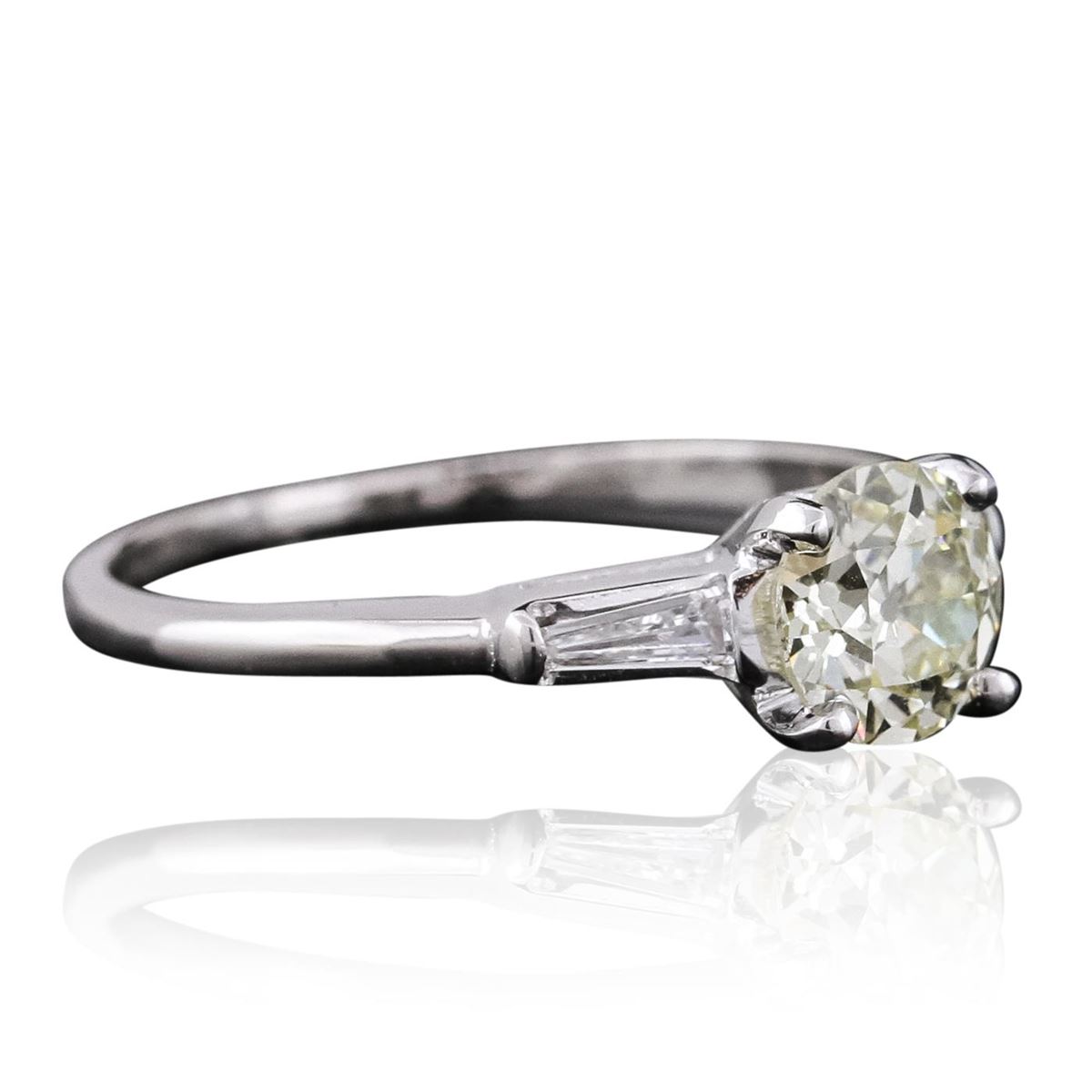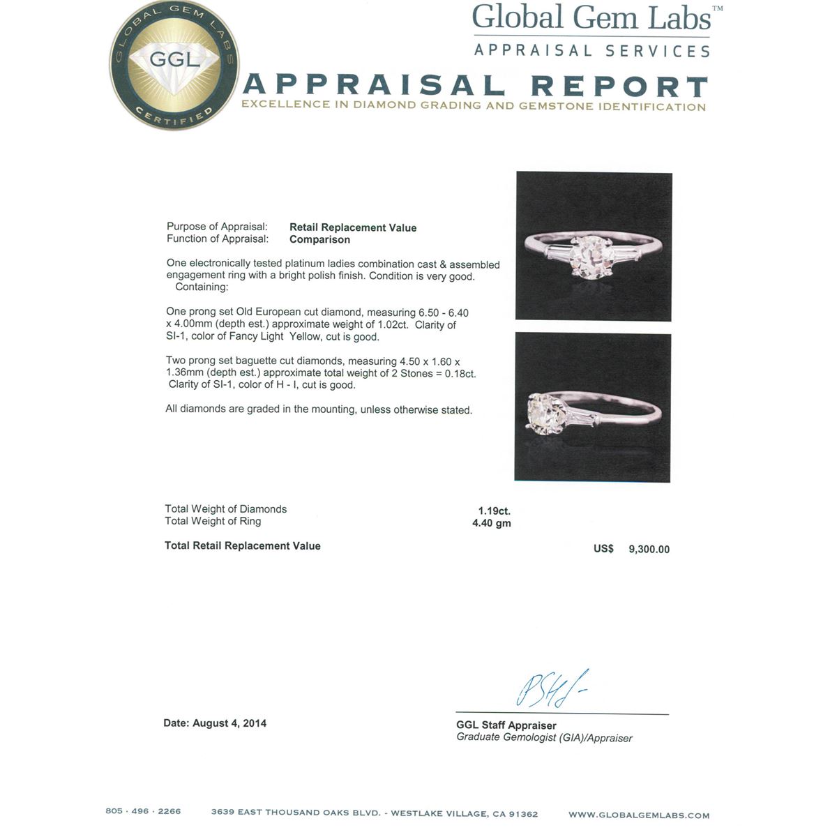 One electronically tested platinum ladies combination cast & assembled engagement ring with a bright polish finish. Condition is very good. Containing: One prong set Old European cut diamond, measuring 6.50 - 6.40 x 4.00mm (depth est.) approximate weight of 1.02ct. Clarity: SI-1, Cut is Good. Two prong set baguette cut diamonds, measuring 4.50 x 1.60 x 1.36mm (depth est.) approximate. Total Weight of 2 Stones = 0.18ct. Clarity: SI-1. Color: H - I, Cut is Good. All diamonds are graded in the mounting, unless otherwise stated. Total Weight of Diamonds 1.19ct. Total Weight of Ring 4.40 grams. GGL Appraised at $9,300.00.