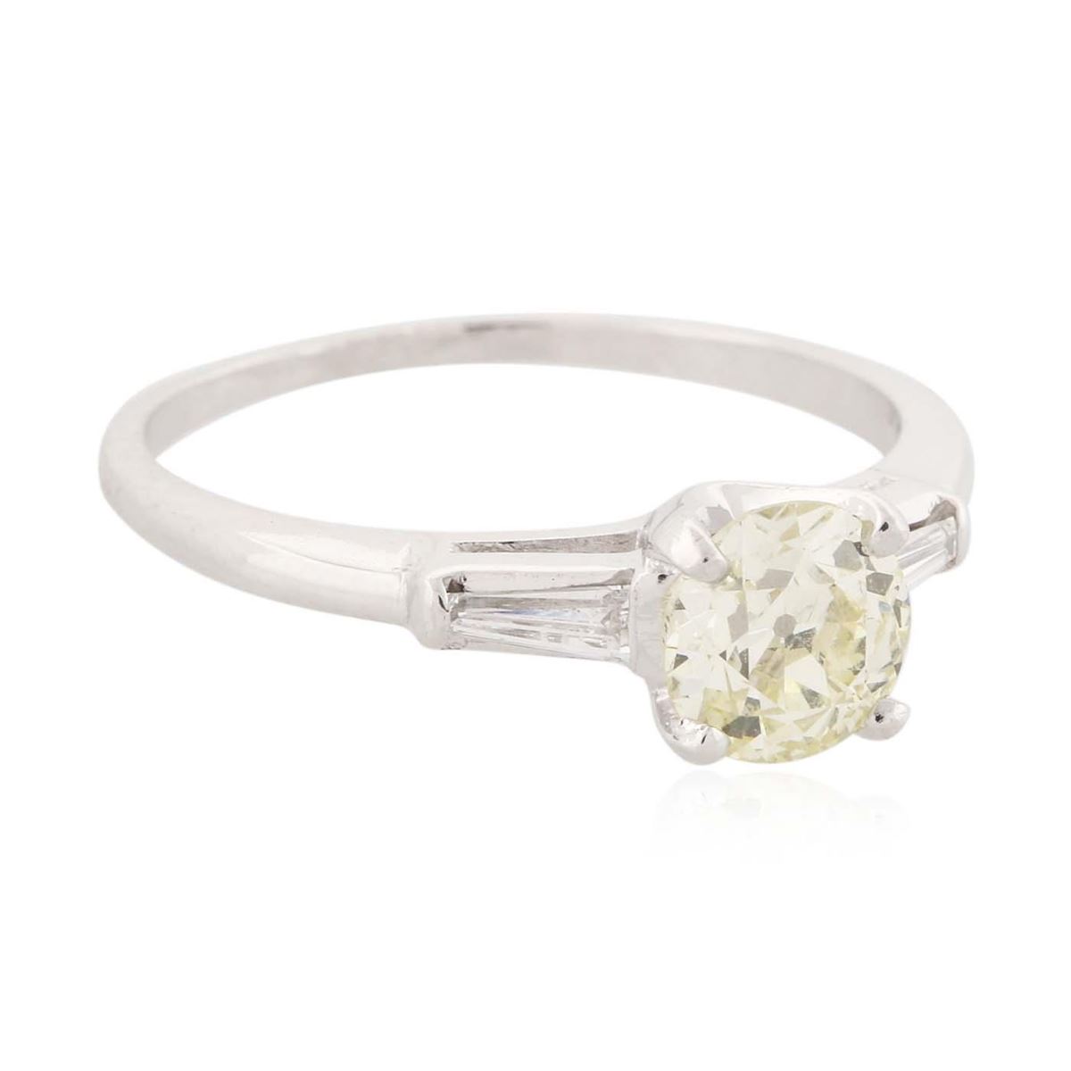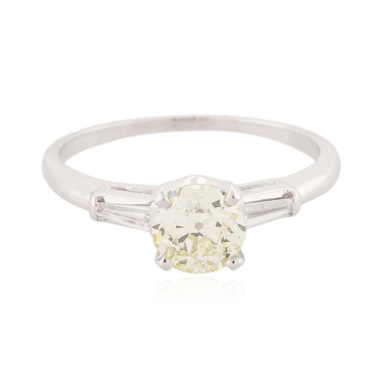 One electronically tested platinum ladies combination cast & assembled engagement ring with a bright polish finish. Condition is very good. Containing: One prong set Old European cut diamond, measuring 6.50 - 6.40 x 4.00mm (depth est.) approximate weight of 1.02ct. Clarity: SI-1, Cut is Good. Two prong set baguette cut diamonds, measuring 4.50 x 1.60 x 1.36mm (depth est.) approximate. Total Weight of 2 Stones = 0.18ct. Clarity: SI-1. Color: H - I, Cut is Good. All diamonds are graded in the mounting, unless otherwise stated. Total Weight of Diamonds 1.19ct. Total Weight of Ring 4.40 grams. GGL Appraised at $9,300.00.