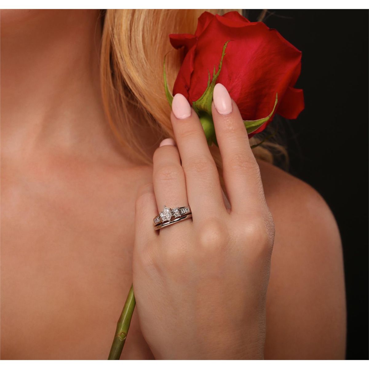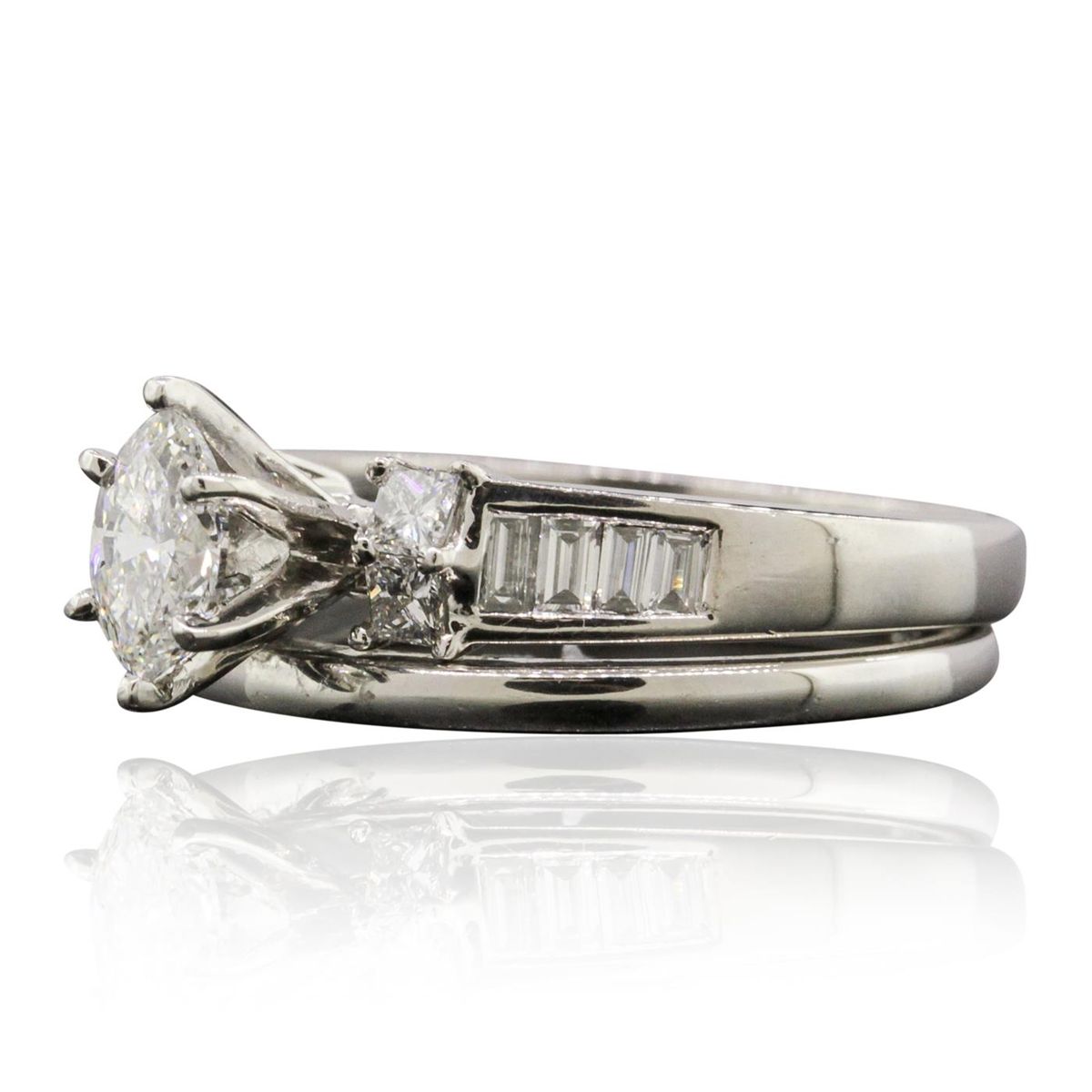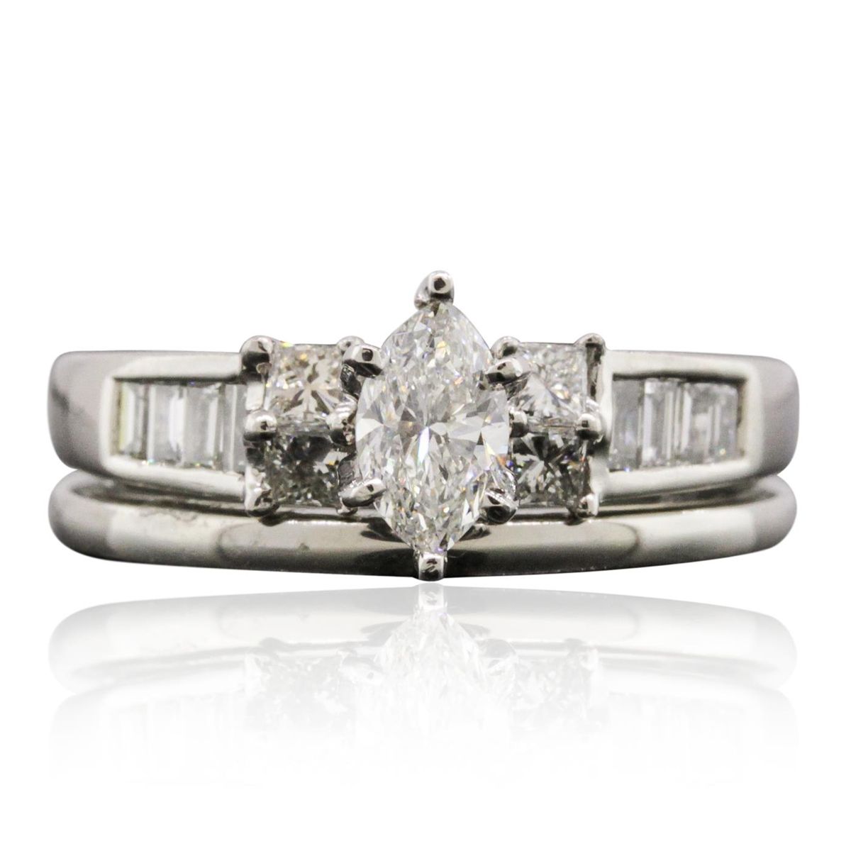 One electronically tested platinum ladies cast diamond wedding set. Condition is new, good workmanship. The wedding set includes a diamond engagement ring and a wedding band. The engagement ring features a diamond supported by diamond set shoulders, completed by a two and one-half millimeter wide band. The set is completed by a matching wedding band with a one and one-half millimeter wide band. Bright polish finish. Identified with markings of "PT 900". Containing: One prong set marquise shaped cut diamond, measuring 6.80 x 4.10 x 2.90mm (depth est.), 4.00.%. GTCF approximate weight of 0.58ct. Graded in the setting. Clarity: SI-2. Color: I Depth 70.7%. Table 52.4%. Four prong set princess cut diamonds, measuring 2.50 x 2.30 x 1.73mm (depth est.) approximate. Total Weight of 4 Stones = 0.42ct. Graded in the setting. Clarity: VVS-2 to VS-1. Color: G - H Eight channel set baguette cut diamonds, measuring from 2.20 x 1.20 x 0.84mm (depth est.) to 2.70 x 1.30 x 0.91mm (depth est.) approximate. Total Weight of 8 Stones = 0.20ct. Graded in the setting. Clarity: VS-2 to SI-1. Color: G - H. Total Weight of Diamonds 1.20ct. Total Weight of Wedding Set 9.45 grams. AIG Appraised at $9,565.00.