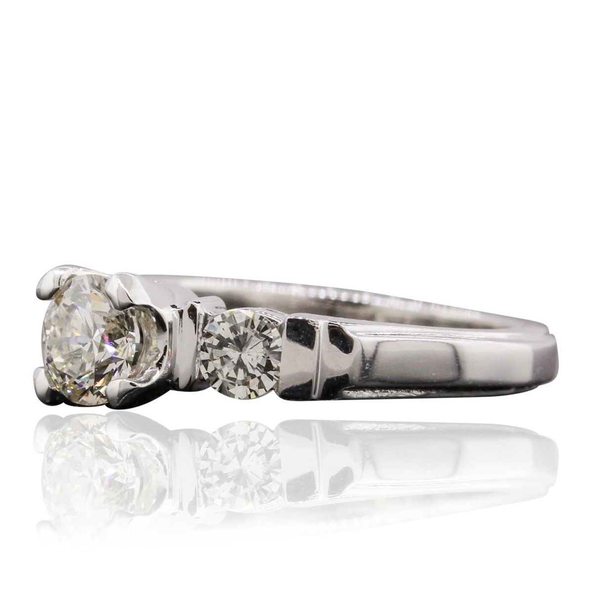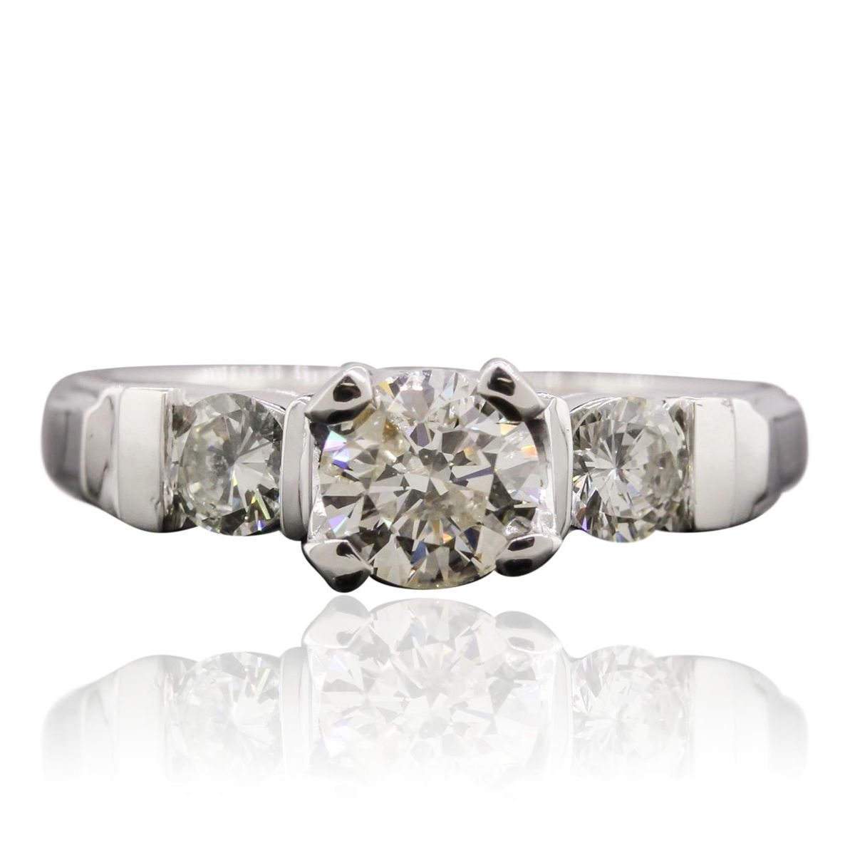 One electronically tested platinum ladies cast diamond unity ring with a bright polish finish. Condition is new, good workmanship. The featured diamond is accented by a single diamond on either side, completed by a grooved two and one-half millimeter wide band. Identified with markings of "PLAT 950". Containing: One prong set round brilliant cut diamond, measuring 5.60 - 5.55 x 3.50mm (depth est.) approximate weight of 0.76ct with a medium blue fluorescence. Graded in the setting. Clarity: I-1 . Color: K Depth 62.8%. Table 57.5%. Two channel set round brilliant cut diamonds, measuring 3.80 - 3.75 x 2.10mm (depth est.) approximate. Total Weight of 2 Stones = 0.44ct. Graded in the setting. Clarity: SI-1 to SI-2 . Color: I - J. Total Weight of Diamonds 1.20ct.. Total Weight of Ring 8.71 grams. AIG Appraised at $9,870.00.
