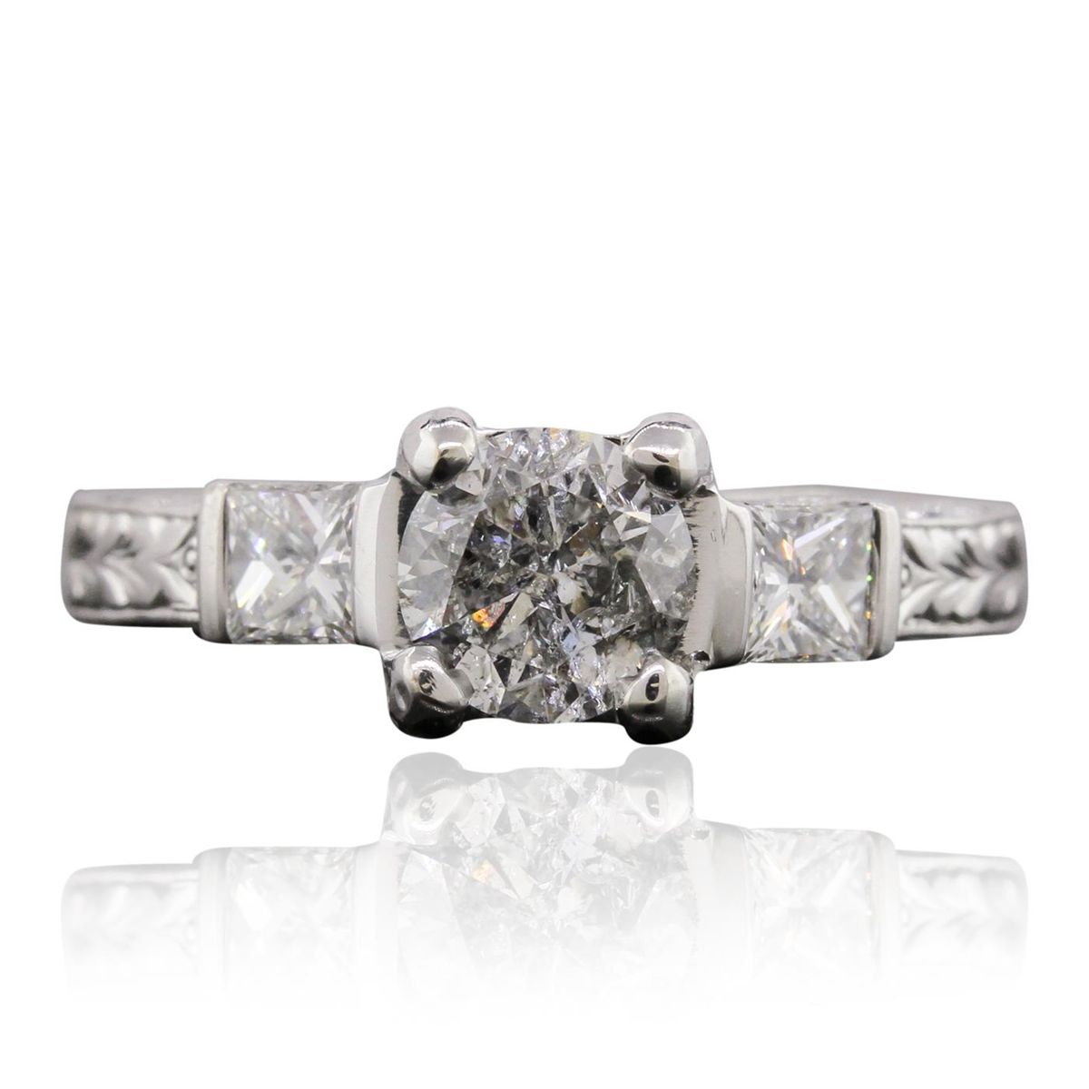 One electronically tested platinum Ladies combination cast & assembled engagement ring with a engraved finish. Condition is new. Identified with markings of "PLAT". Containing: One prong set round brilliant cut diamond, measuring 6.30 - 6.20 x 3.90mm (depth est.) approximate weight of 0.93ct. Clarity: I-2. Color: H, Cut is Good. Two prong set princess cut diamonds, measuring 3.20 x 3.20 x 2.40mm (depth est.) approximate. Total Weight of 2 Stones = 0.40ct. Clarity: VS-2. Color: H - I, Cut is Very Good. Total Weight of Diamonds 1.33ct. Total Weight of Engagement Ring 9.00 grams. GGL Appraised at $10,631.89.