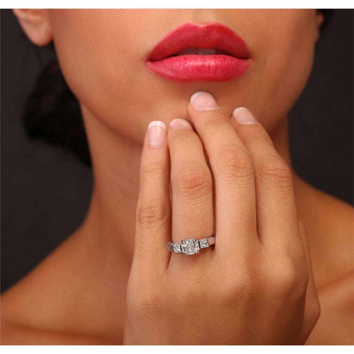 One electronically tested platinum Ladies combination cast & assembled engagement ring with a engraved finish. Condition is new. Identified with markings of "PLAT". Containing: One prong set round brilliant cut diamond, measuring 6.30 - 6.20 x 3.90mm (depth est.) approximate weight of 0.93ct. Clarity: I-2. Color: H, Cut is Good. Two prong set princess cut diamonds, measuring 3.20 x 3.20 x 2.40mm (depth est.) approximate. Total Weight of 2 Stones = 0.40ct. Clarity: VS-2. Color: H - I, Cut is Very Good. Total Weight of Diamonds 1.33ct. Total Weight of Engagement Ring 9.00 grams. GGL Appraised at $10,631.89.