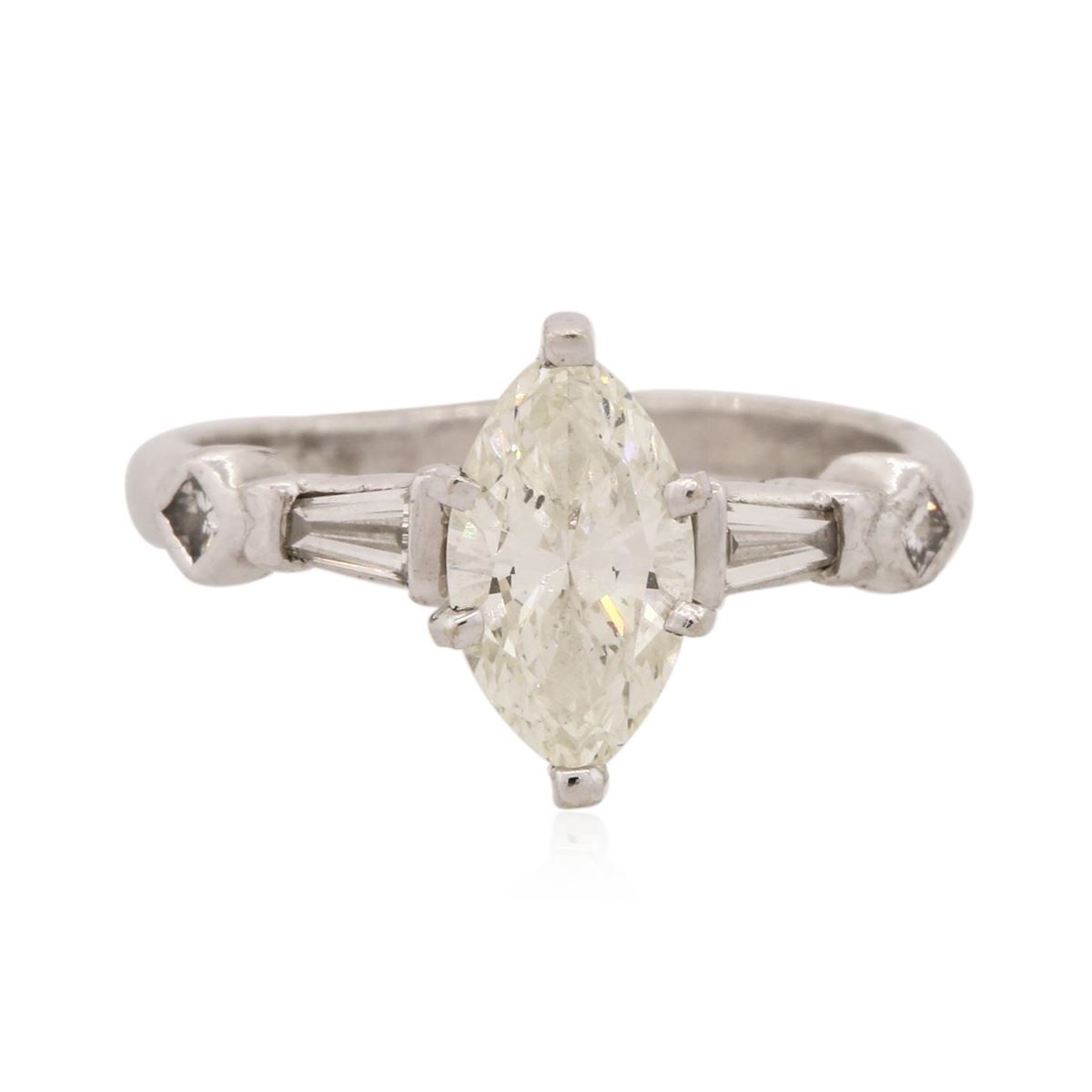 One electronically tested platinum Ladies combination cast & assembled engagement ring with a bright polish finish. Condition is new. Identified with markings of "PT 950". Containing: One prong set marquise shaped cut diamond, measuring 10.00 x 5.64 x 3.55mm (depth est.) approximate weight of 1.16ct. Clarity: SI-2. Color: J, Cut is Good. Two bezel set princess cut diamonds, measuring 2.00 x 2.00 x 1.50mm (depth est.) approximate total weight of 2 Stones = 0.10ct. Clarity: VS-2. Color: J, Cut is Very Good. Two prong set baguette cut (tapered) diamonds, measuring 3.50 x 1.60 x 1.36mm (depth est.) approximate total weight of 2 Stones = 0.14ct. Clarity: SI-1. Color: I, Cut is Very Good. All diamonds are graded in the mounting, unless otherwise stated. Total Weight of Diamonds 1.40ct. Total Weight of Engagement Ring 5.20 grams. GGL Appraised at $16,280.00.