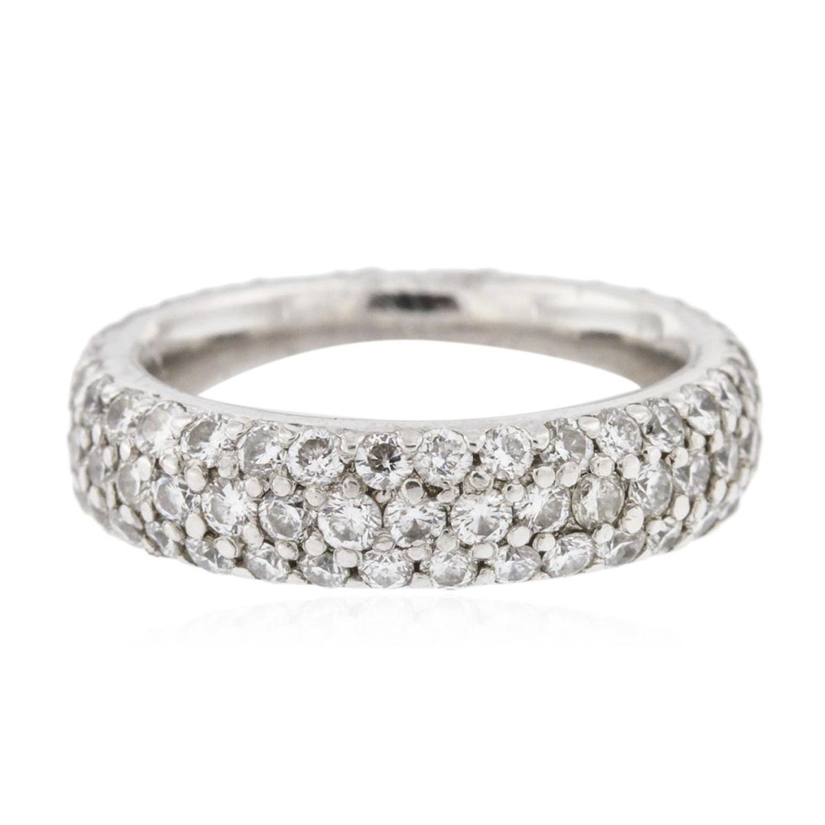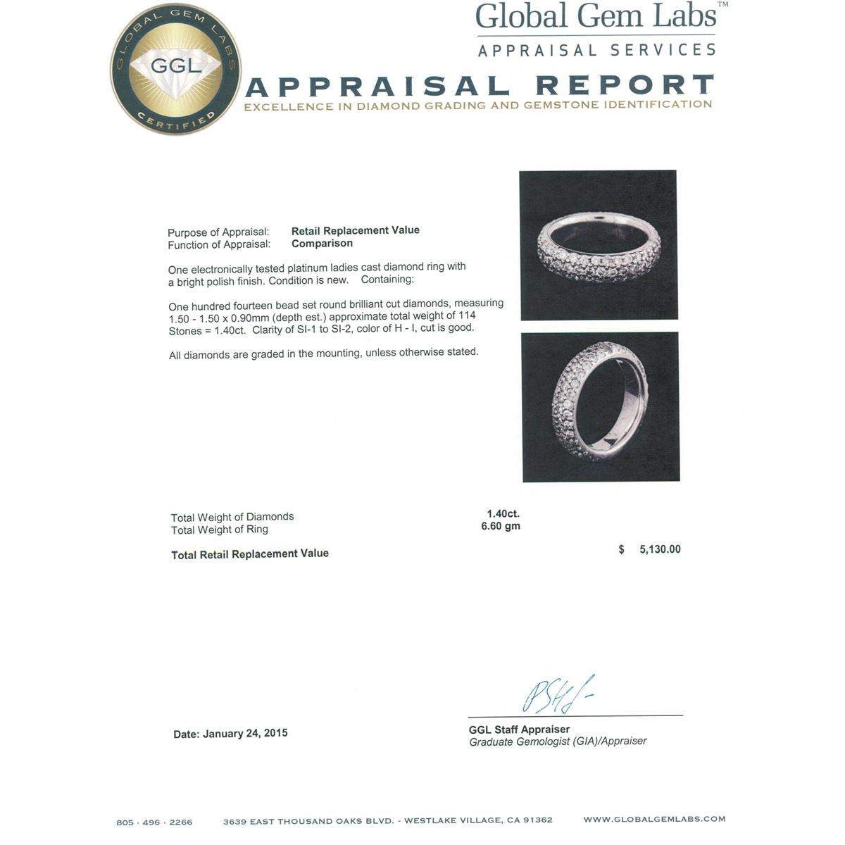 One electronically tested platinum ladies cast diamond ring with a bright polish finish. Condition is new. Containing: One Hundred Fourteen bead set round brilliant cut diamonds, measuring 1.50 - 1.50 x 0.90mm (depth est.) approximate total weight of 114 Stones = 1.40ct. Clarity: SI-1 to SI-2. Color: H - I, Cut is Good. All diamonds are graded in the mounting, unless otherwise stated. Total Weight of Diamonds 1.40ct. Total Weight of Ring 6.60 grams. GGL Appraised at $5,130.00.