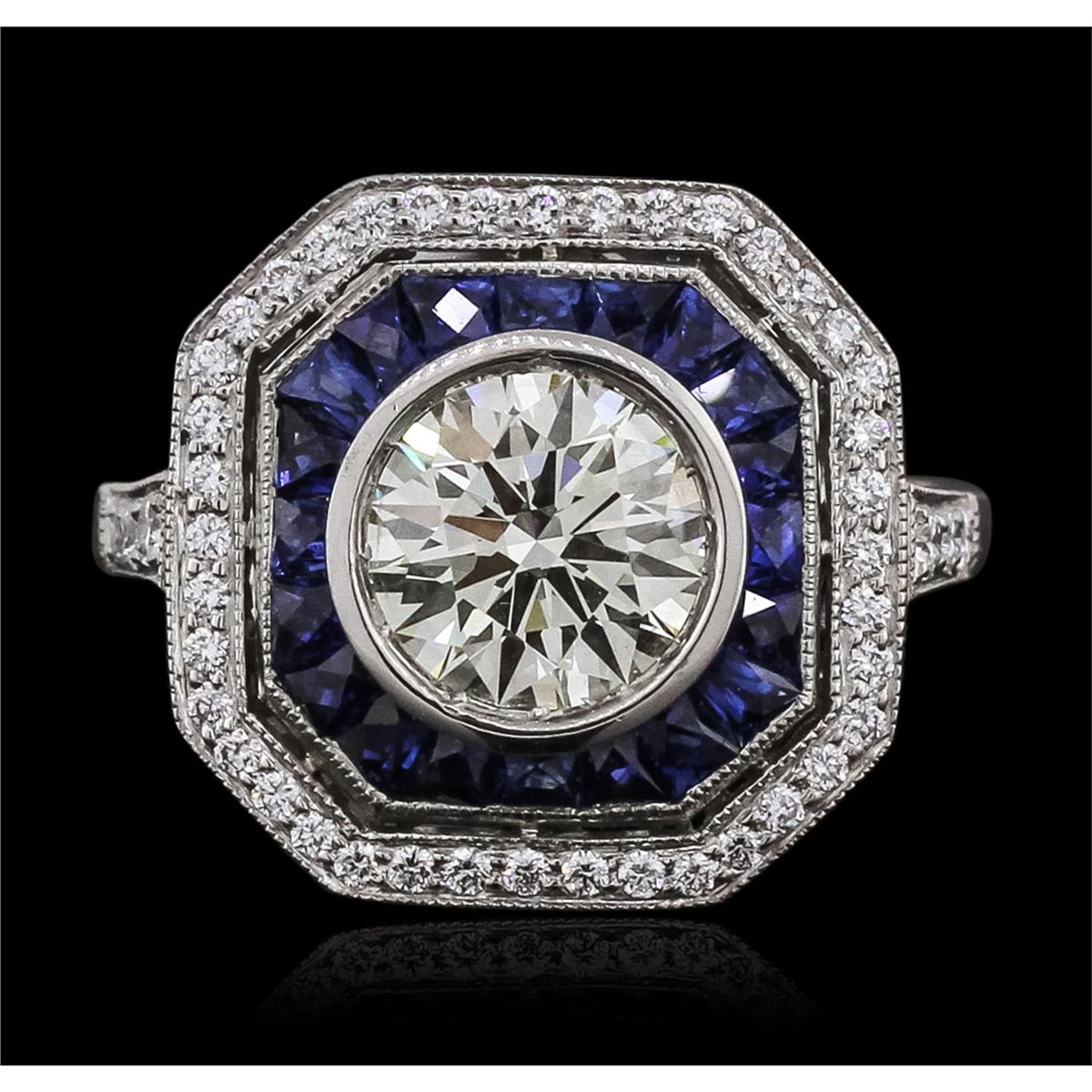 One electronically tested platinum ladies cast diamond and sapphire ring. The featured diamond is set within an inner sapphire bezel and an outer diamond bezel supported by diamond set shoulders, completed by a two millimeter wide band. Bright polish finish with milgrain detailing. Trademark is SOPHIA D. Identified with markings of "PT950".The ring is reminiscent of the jewelry designs from the Art Deco Period. The Paris Exposition of Decorative Arts and Modern Manufacturers in 1925 gave the movement its name. The Art Deco Period is characterized with jewelry designs composed of bold geometric designs, & cubism. Condition is new, good workmanship. Containing: One bezel set round brilliant cut diamond, measuring 7.30 - 7.20 x 4.20mm (depth est.) approximate weight of 1.32ct with a faint blue fluorescence. Graded in the setting. Clarity: VS-1. Color: K. Depth 57.9%. Table 55.2%. Forty-Six bead set round brilliant cut diamonds, measuring 1.40 - 1.00 x 0.72mm (depth est.) approximate total weight of 46 Stones = 0.26ct. Graded in the setting. Clarity: VVS-1 to VS-1. Color: G - I Twenty channel set trapezoid step cut natural blue sapphires approximate total weight of 0.86ct., clarity is eye clean, type II, medium dark, moderately strong, blue color, (GIA B 6/4), cut is good. Transmitting light with no distortion, transparent. Color grade is an average for the group. Graded in the setting. Total Weight of Colored Stones 0.86ct. Total Weight of Diamonds 1.58ct. Total Weight of Ring 6.67gm. AIG Appraised at $32,430.00.
