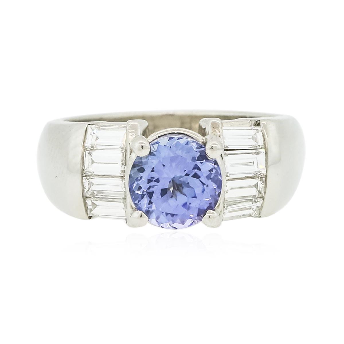 One electronically tested platinum ladies combination cast & assembled tanzanite and diamond ring with a bright polish finish. Identified with markings of "PLAT". Condition is new. Containing: One prong set round modified brilliant cut natural tanzanite, measuring 7.20 - 7.20 x 4.68 mm, approximate weight of 1.63ct., clarity is eye clean, type I, light, very slightly grayish, violet color, (GIA V 3/3), cut is very good. Eight channel set baguette cut diamonds, measuring 3.50 x 1.80 x 1.53mm (depth est.) approximate total weight of 8 Stones = 0.71ct. Clarity: VS-2. Color: G - H, Cut is Good. Colored gemstones are presumed to have been subjected to commonly used enhancement processes. All diamonds and colored gemstones are graded in the mounting, unless otherwise stated. Total Weight of Colored Stones 1.63ct. Total Weight of Diamonds 0.71ct. Total Weight of Ring 16.60 grams. GGL Appraised at $7,920.00.