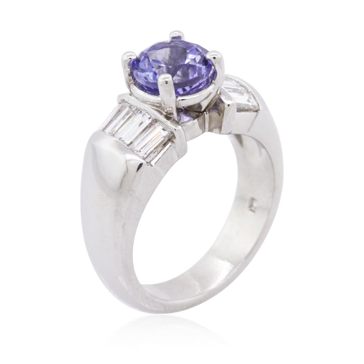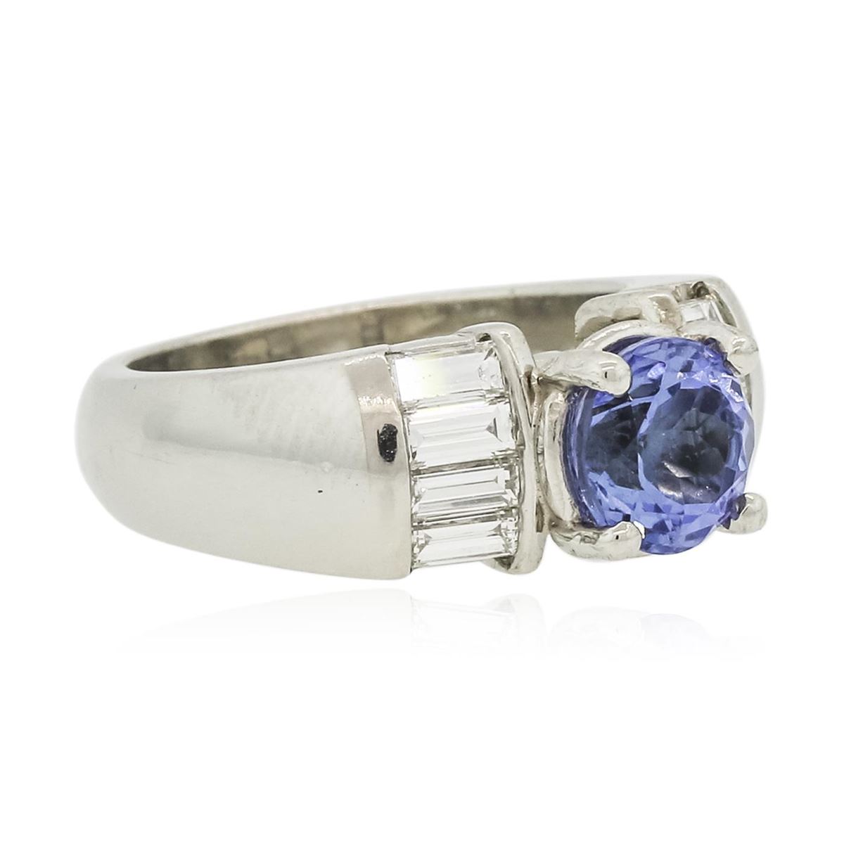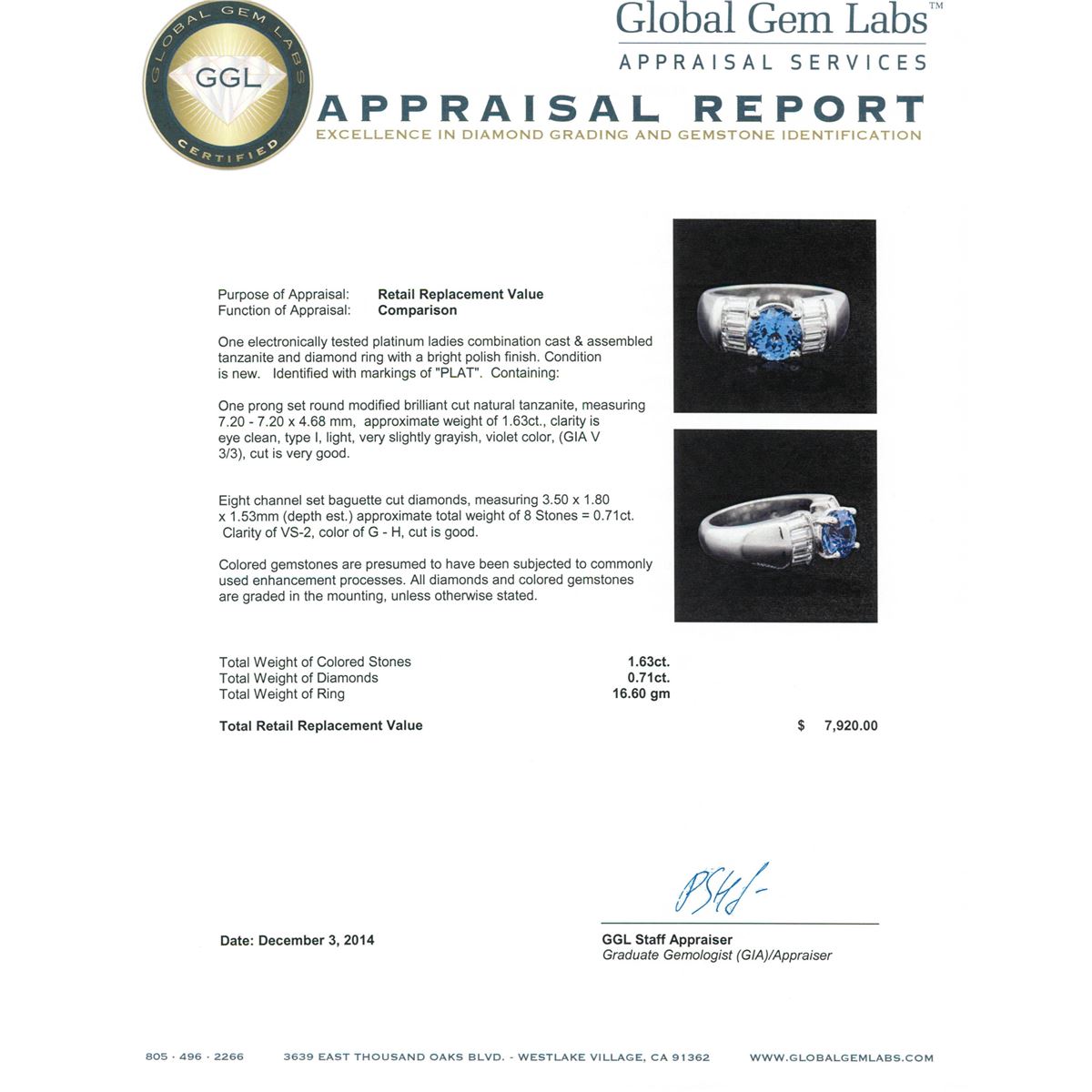 One electronically tested platinum ladies combination cast & assembled tanzanite and diamond ring with a bright polish finish. Identified with markings of "PLAT". Condition is new. Containing: One prong set round modified brilliant cut natural tanzanite, measuring 7.20 - 7.20 x 4.68 mm, approximate weight of 1.63ct., clarity is eye clean, type I, light, very slightly grayish, violet color, (GIA V 3/3), cut is very good. Eight channel set baguette cut diamonds, measuring 3.50 x 1.80 x 1.53mm (depth est.) approximate total weight of 8 Stones = 0.71ct. Clarity: VS-2. Color: G - H, Cut is Good. Colored gemstones are presumed to have been subjected to commonly used enhancement processes. All diamonds and colored gemstones are graded in the mounting, unless otherwise stated. Total Weight of Colored Stones 1.63ct. Total Weight of Diamonds 0.71ct. Total Weight of Ring 16.60 grams. GGL Appraised at $7,920.00.