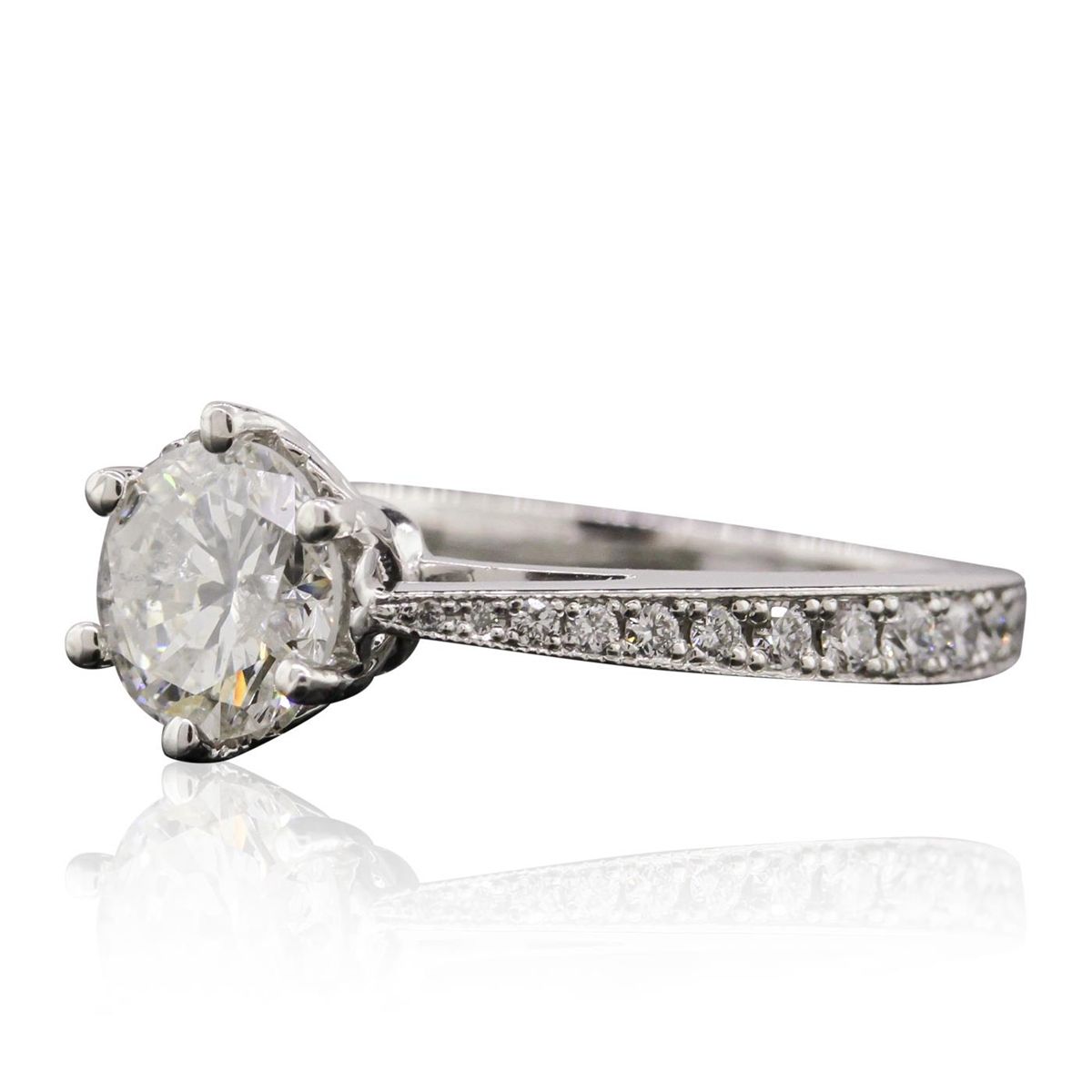 One electronically tested platinum ladies cast diamond unity ring. The featured diamond is supported by tapering diamond set shoulders, completed by a one and one-half millimeter wide band. Bright polish finish with milgrain detailing. Trademark is JA. Identified with markings of "PLAT". Condition is new, good workmanship. Containing: One prong set round brilliant cut diamond, measuring 6.40 - 6.38 x 3.90mm (depth est.), 5.00.%. GTCF approximate weight of 1.12ct. Graded in the setting. Clarity: I-1. Color: J Depth 61.0%. Table 75.1%. Sixteen bead set round brilliant cut diamonds, measuring 1.90 - 1.70 x 1.08mm (depth est.) approximate. Total Weight of 16 Stones = 0.44ct. Graded in the setting. Clarity: VVS-2 to VS-2. Color: G - I Twelve bead set round brilliant cut diamonds, measuring 1.20 - 0.90 x 0.63mm (depth est.) approximate. Total Weight of 12 Stones = 0.10ct. Graded in the setting. Clarity: VVS-2 to VS-2. Color: G - I. Total Weight of Diamonds 1.66ct. Total Weight of Ring 5.10 grams. AIG Appraised at $17,755.00.