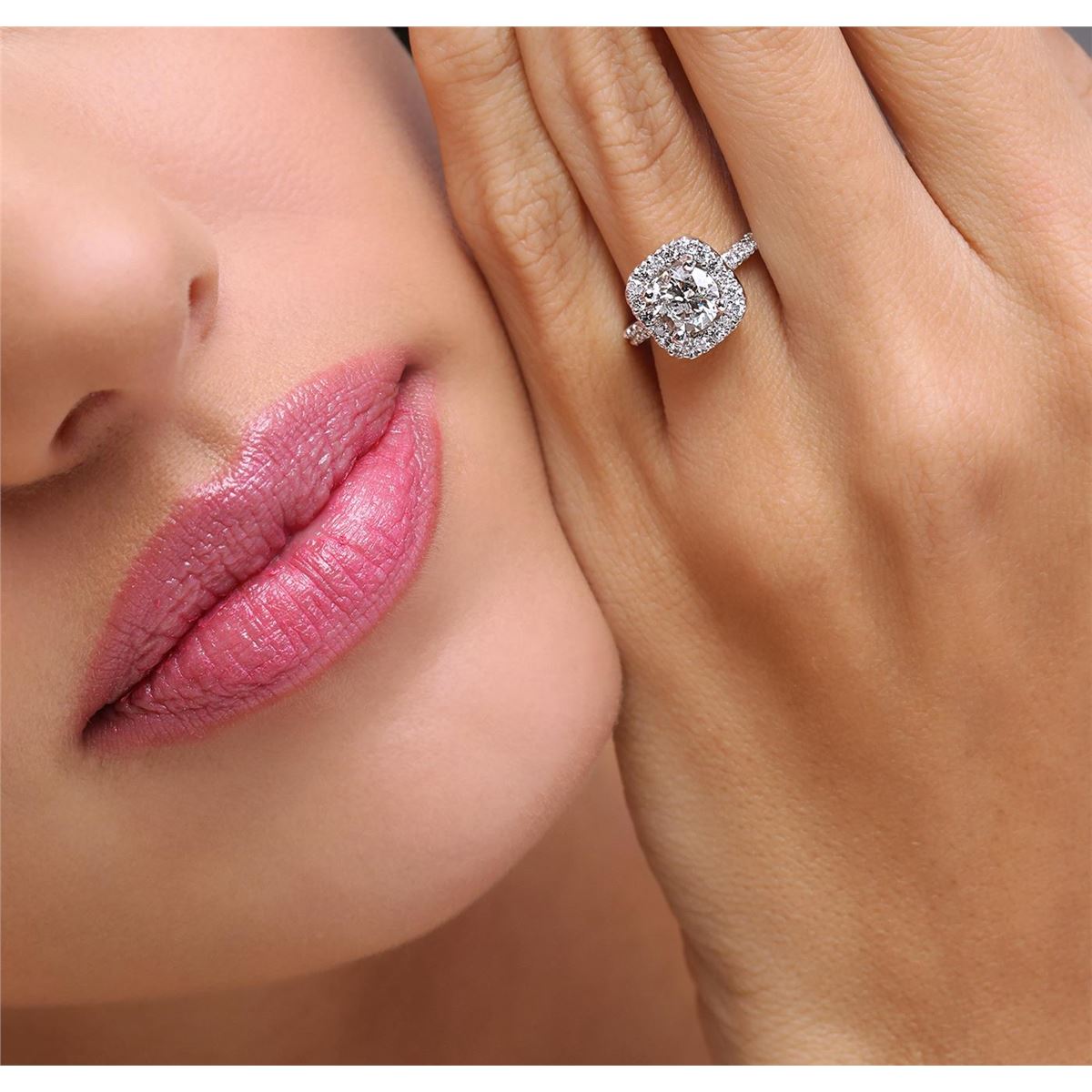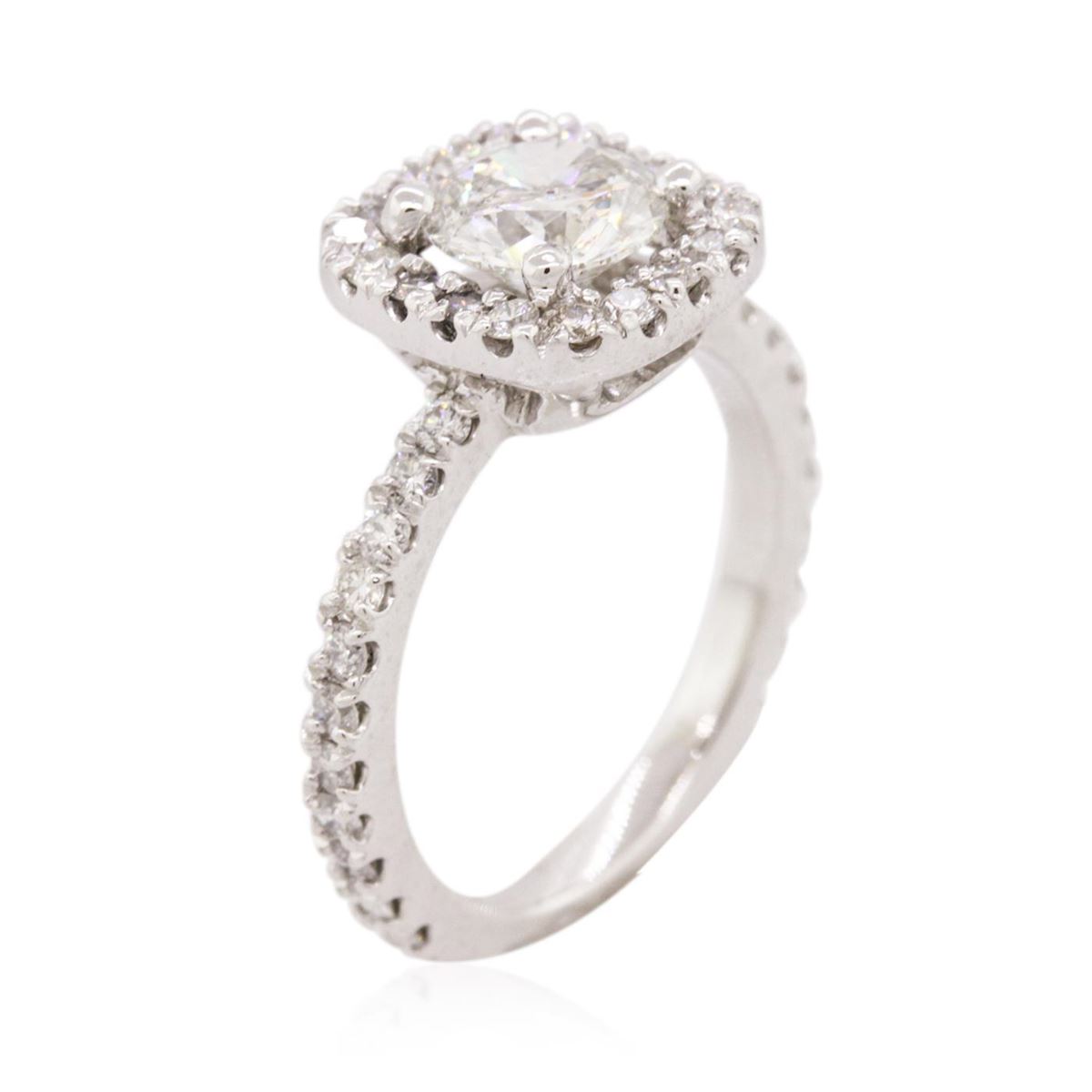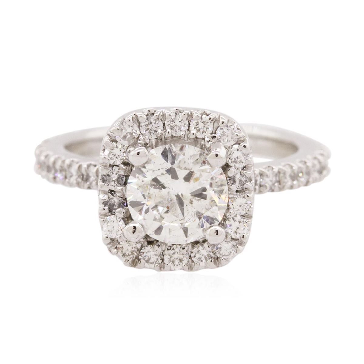 One electronically tested platinum ladies cast diamond ring with a bright polish finish. The featured diamond is set within a diamond bezel supported by diamond set shoulders, completed by a two millimeter wide band. Identified with markings of "PLAT". Condition is new, good workmanship. Containing: One prong set round brilliant cut diamond, measuring 6.50 - 6.40 x 3.75mm (depth est.) approximate weight of 1.05ct. Graded in the setting. Clarity: I-1. Color: I. Depth 58.1%. Table 63.6%. Forty prong set round brilliant cut diamonds, measuring 1.60 - 1.50 x 0.93mm (depth est.) approximate total weight of 40 Stones = 0.64ct. Graded in the setting. Clarity: VS-2 to SI-2. Color: G - I. Total Weight of Diamonds 1.69ct. Total Weight of Ring 6.17 grams. AIG Appraised at $18,185.00.