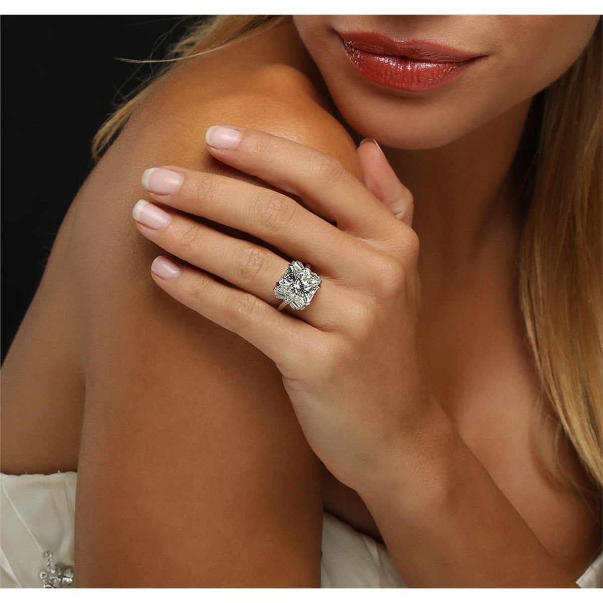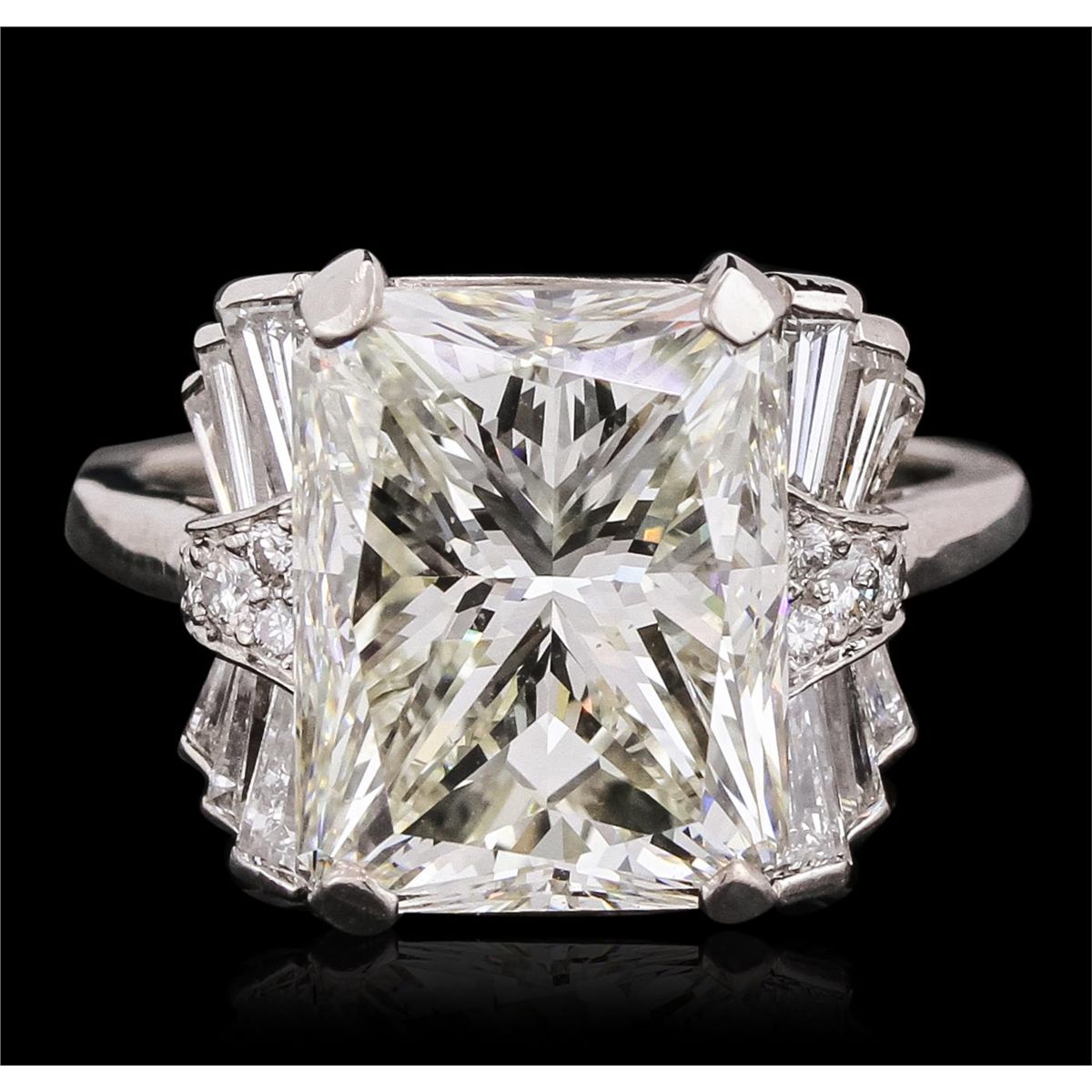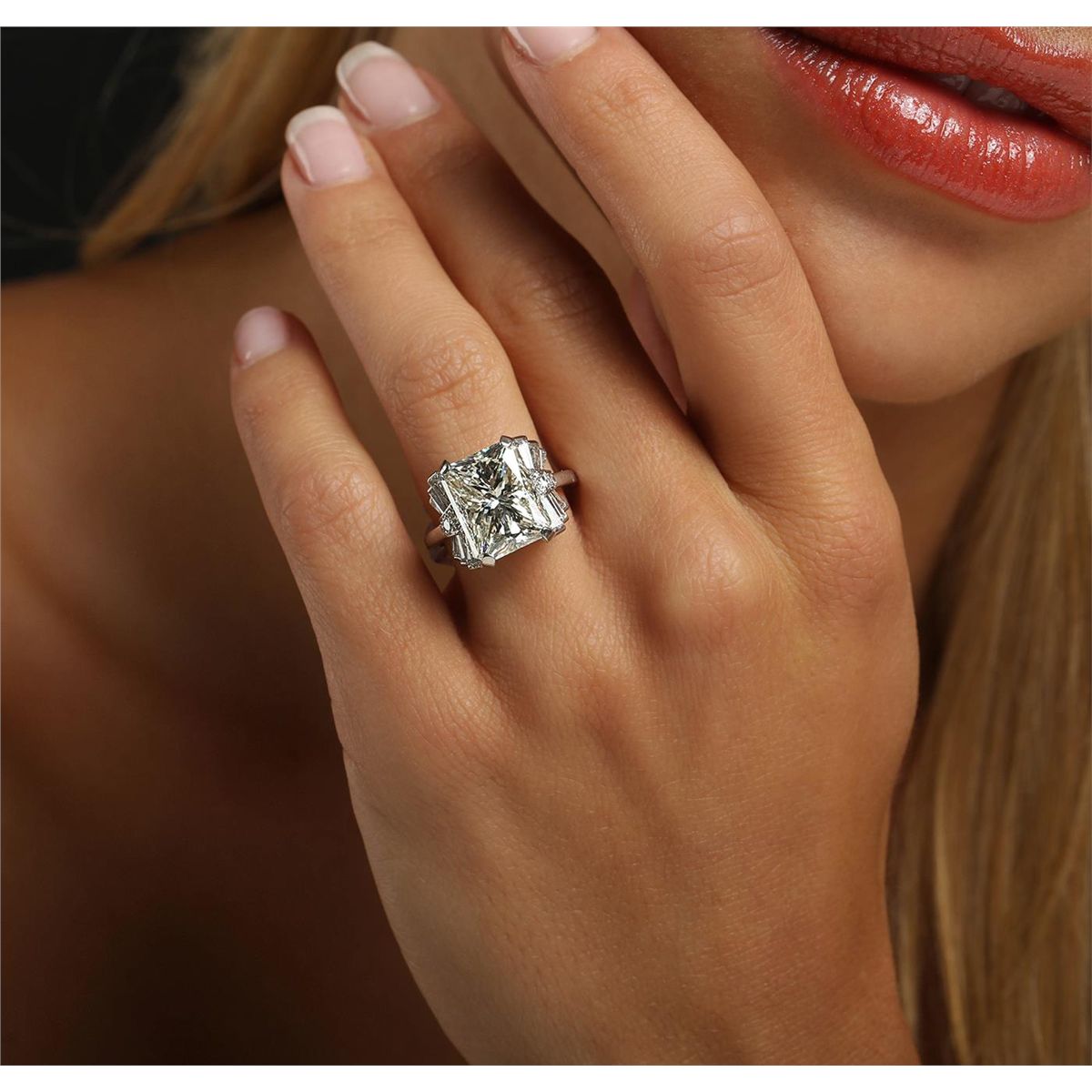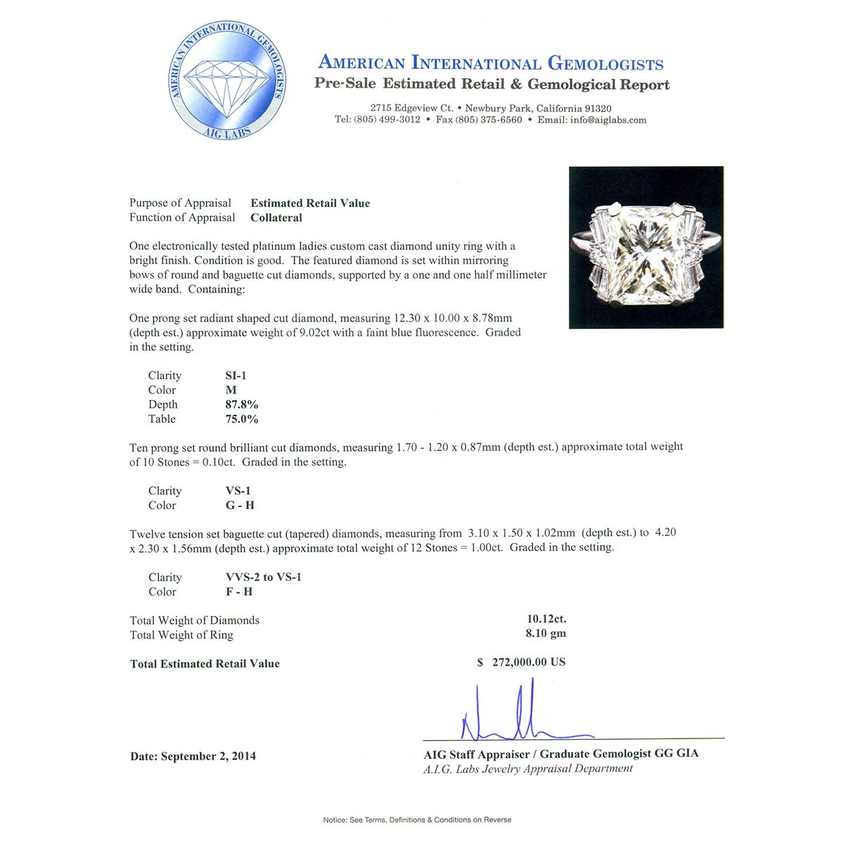 One electronically tested platinum ladies custom cast diamond unity ring with a bright finish. The featured diamond is set within mirroring bows of round and baguette cut diamonds, supported by a one and one half millimeter wide band. Condition is good. Containing: One prong set radiant shaped cut diamond, measuring 12.30 x 10.00 x 8.78mm (depth est.) approximate weight of 9.02ct with a faint blue fluorescence. Graded in the setting. Clarity: SI-1. Color: M. Depth 87.8%. Table 75.0%. Ten prong set round brilliant cut diamonds, measuring 1.70 - 1.20 x 0.87mm (depth est.) approximate total weight of 10 Stones = 0.10ct. Graded in the setting. Clarity: VS-1. Color: G - H Twelve tension set baguette cut (tapered) diamonds, measuring from 3.10 x 1.50 x 1.02mm (depth est.) to 4.20 x 2.30 x 1.56mm (depth est.) approximate total weight of 12 Stones = 1.00ct. Graded in the setting. Clarity: VVS-2 to VS-1. Color: F - H. Total Weight of Diamonds 10.12ct. Total Weight of Ring 8.10 grams. AIG Appraised at $272,000.00.