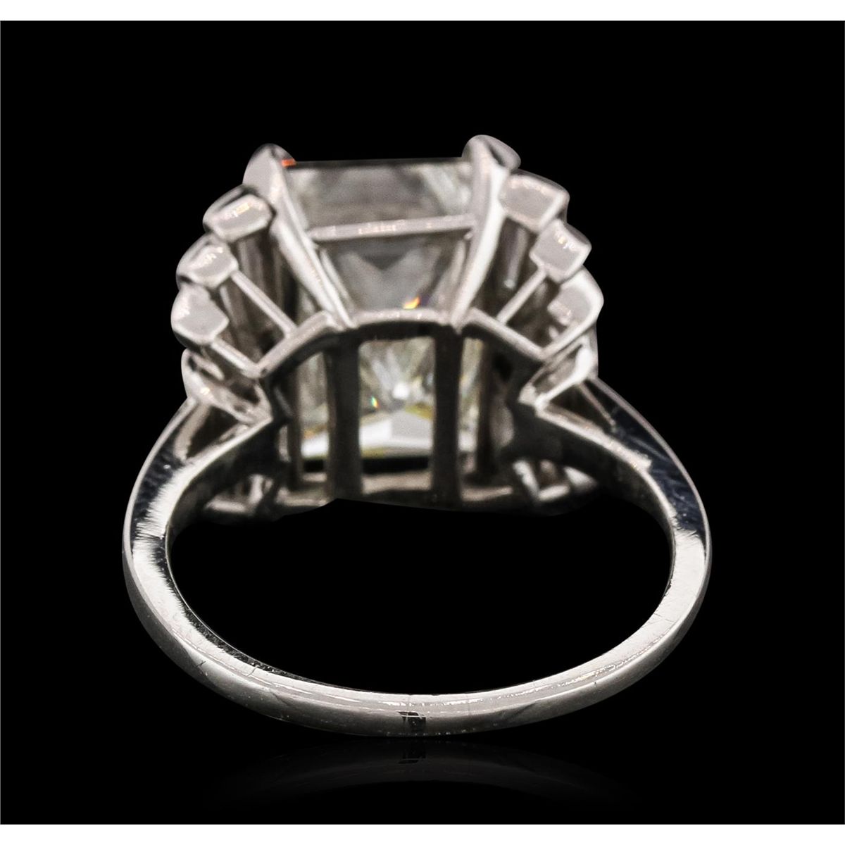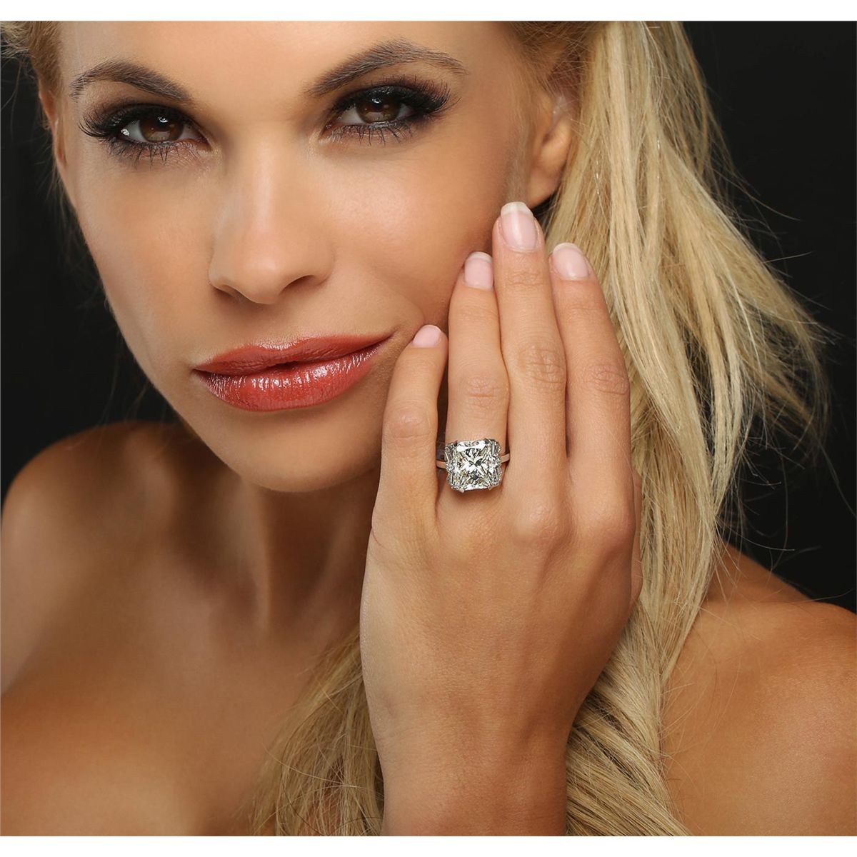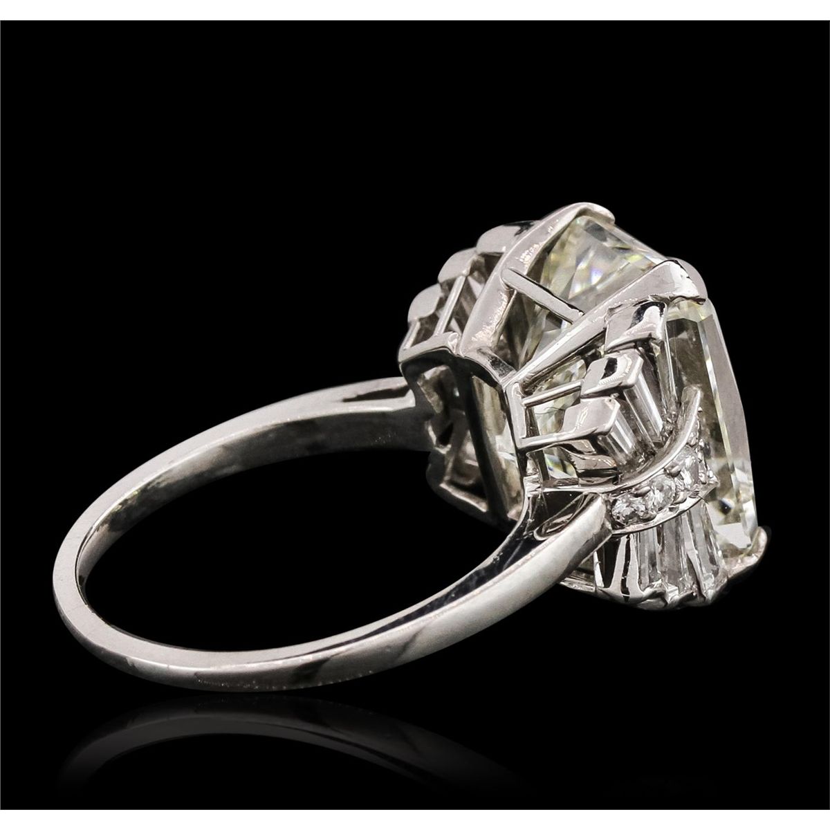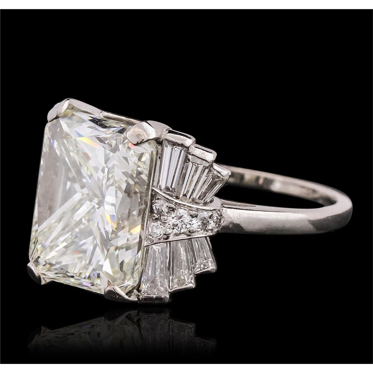 One electronically tested platinum ladies custom cast diamond unity ring with a bright finish. The featured diamond is set within mirroring bows of round and baguette cut diamonds, supported by a one and one half millimeter wide band. Condition is good. Containing: One prong set radiant shaped cut diamond, measuring 12.30 x 10.00 x 8.78mm (depth est.) approximate weight of 9.02ct with a faint blue fluorescence. Graded in the setting. Clarity: SI-1. Color: M. Depth 87.8%. Table 75.0%. Ten prong set round brilliant cut diamonds, measuring 1.70 - 1.20 x 0.87mm (depth est.) approximate total weight of 10 Stones = 0.10ct. Graded in the setting. Clarity: VS-1. Color: G - H Twelve tension set baguette cut (tapered) diamonds, measuring from 3.10 x 1.50 x 1.02mm (depth est.) to 4.20 x 2.30 x 1.56mm (depth est.) approximate total weight of 12 Stones = 1.00ct. Graded in the setting. Clarity: VVS-2 to VS-1. Color: F - H. Total Weight of Diamonds 10.12ct. Total Weight of Ring 8.10 grams. AIG Appraised at $272,000.00.