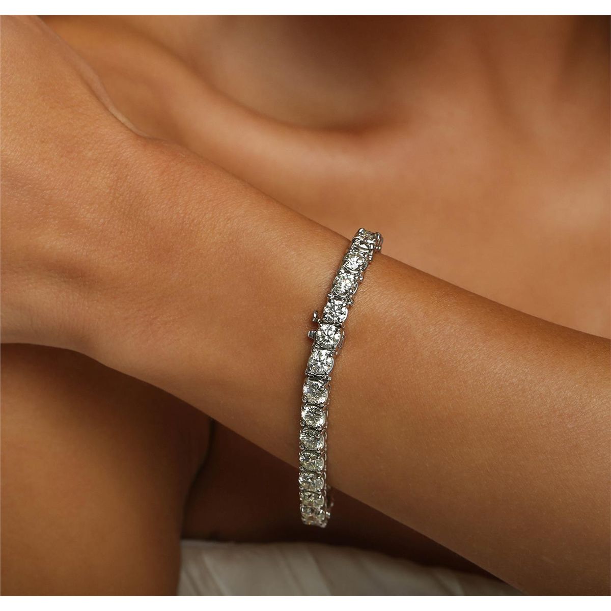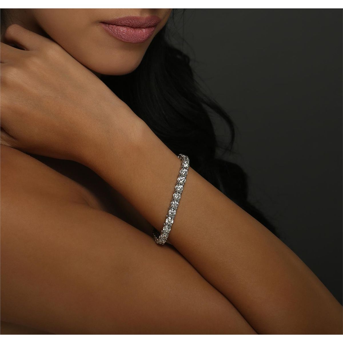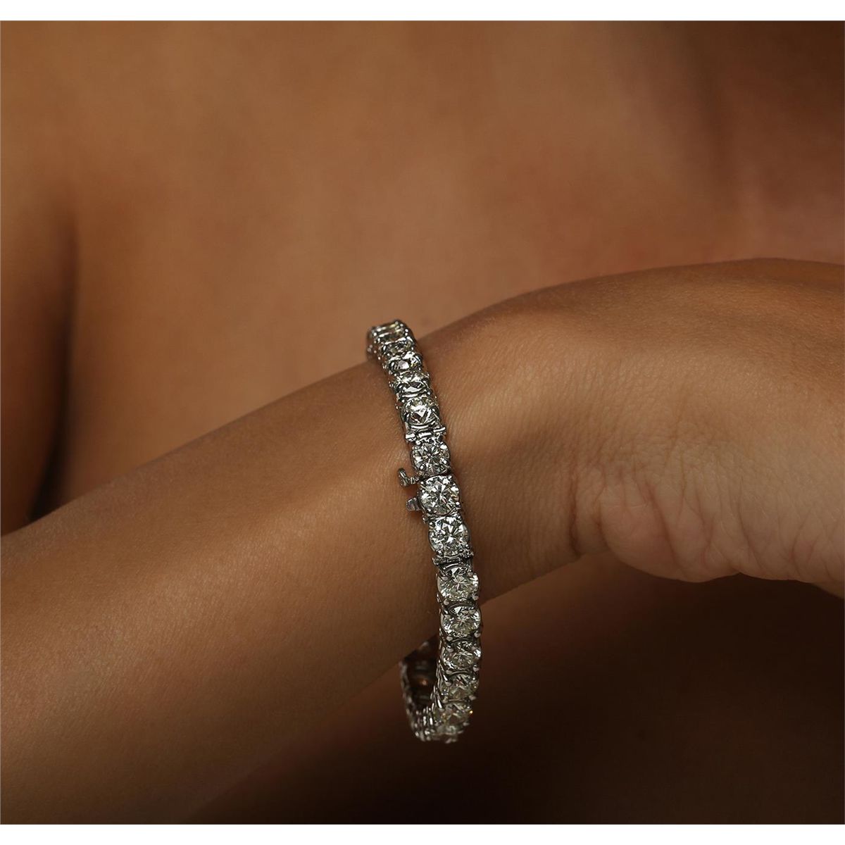One electronically tested platinum ladies cast & assembled diamond tennis bracelet with a bright finish. The six and one quarter inch length bracelet is set with twenty eight diamonds, completed by a concealed clasp, with safety. Tennis bracelets got their unusual name from an incident involving the U.S. professional tennis player Chris Evert during a tennis match in the 1980's. Evert had been wearing an expensive diamond bracelet, an inline string of individually-set diamonds. Previously these bracelets were known as eternity bracelets. When the clasp snapped during play, she asked the officials to stop the tennis match until the bracelet could be found. Since that day, bracelets featuring an inline string of diamonds have been called tennis bracelets Identified with markings of "950". Condition is good. Containing: Twenty-Eight prong set round brilliant cut diamonds, measuring 5.50 - 5.00 x 3.15mm (depth est.) approximate total weight of 28 Stones = 14.91ct. Graded in the setting. Clarity: SI-1 to SI-2. Total Weight of Diamonds 14.91ct. Total Weight of Bracelet 28.40 grams. AIG Appraised at $86,000.00.