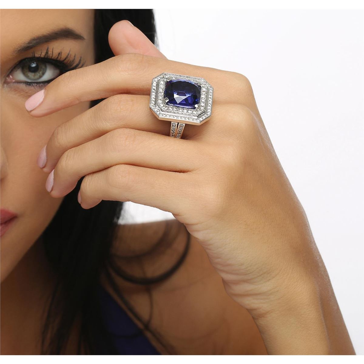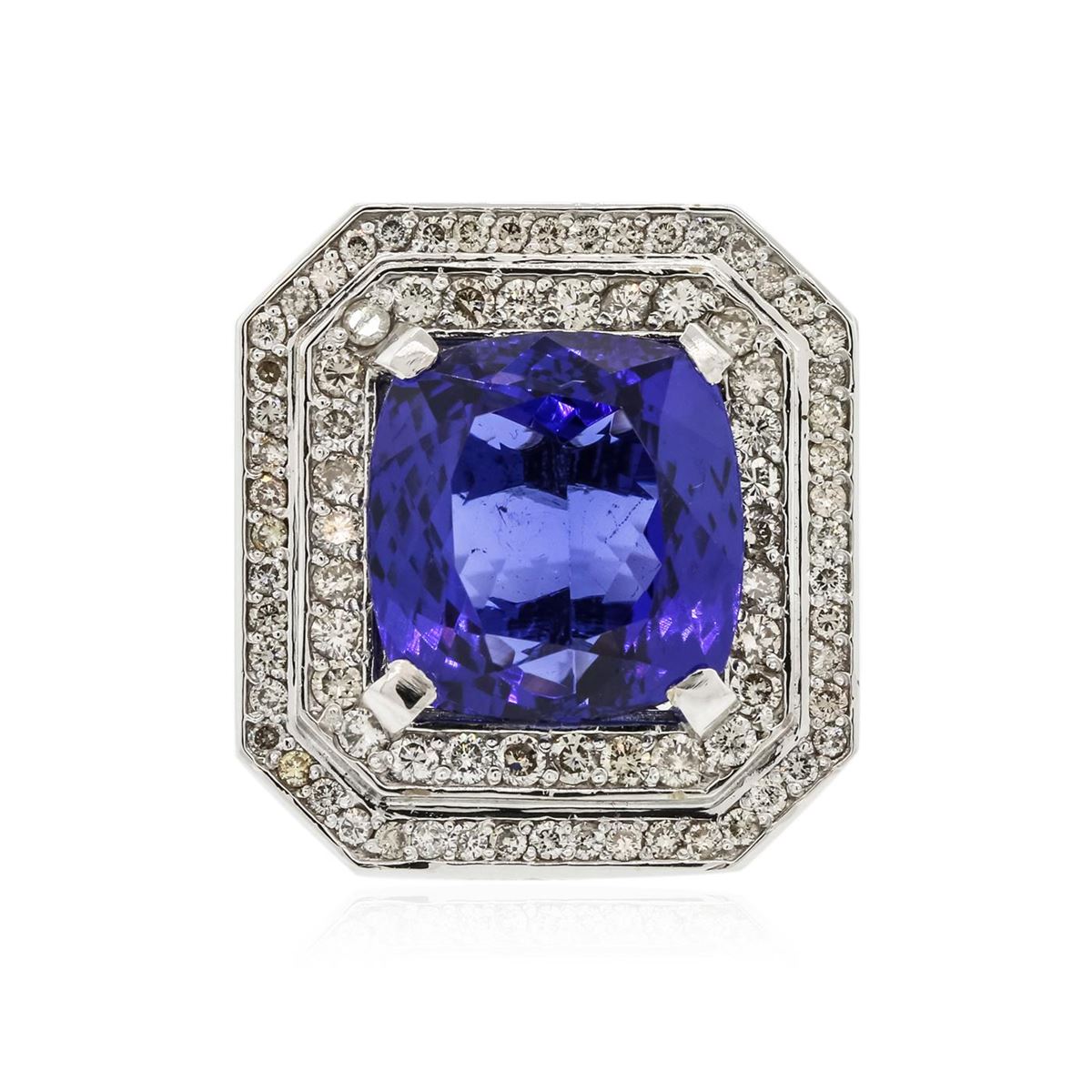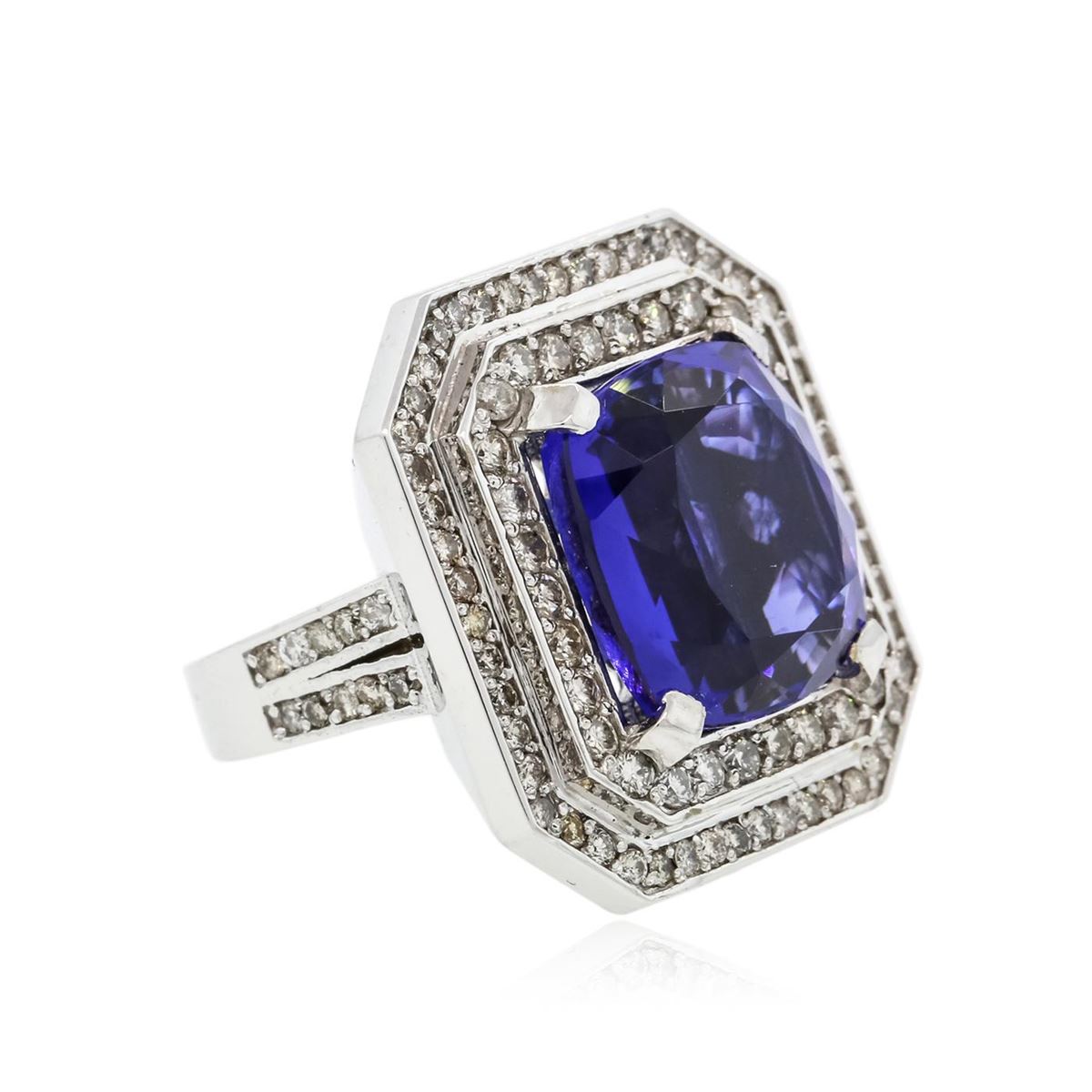 One electronically tested platinum lady's combination cast and assembled ring with a bright polish finish. Condition is new. Containing: One prong set square cushion modified brilliant cut natural tanzanite, measuring 14.73 x 14.24 x 9.60mm, approximate weight of 15.86ct., clarity is eye clean, type I, medium, moderately strong, violetish blue color, (GIA vB 5/4), cut is very good. Colored gemstones are presumed to have been subjected to commonly used color/clarity enhancement processes. One Hundred Two prong set round brilliant cut diamonds, measuring 2.00 - 1.50 x 1.05mm (depth est.) approximate. Total Weight of 102 Stones = 2.07ct. Clarity: I-1 to I-2. Color: I - J, Cut is Very Good. Total Weight of Colored Stones 15.86ct. Total Weight of Diamonds 2.07ct. Total Weight of Ring 21.30 grams. GGL Appraised at $37,580.00.